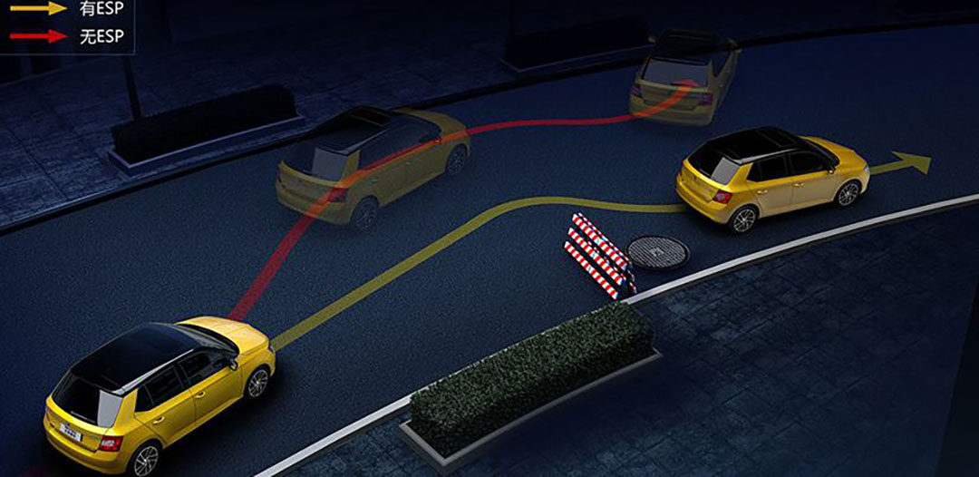 ESC车身稳定系统其实是基于防抱死刹车系统(ABS)以及牵引力控制系统(ASR)所衍生的高级配置。当车辆发生失控,ESC系统通过电子控制单元(ECU)对发动机以及制动系统进行干预,切断失控或打滑轮毂的动力输出,从而修正车辆的行驶轨迹,避免侧滑的现象发生。