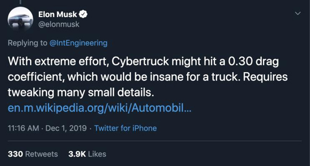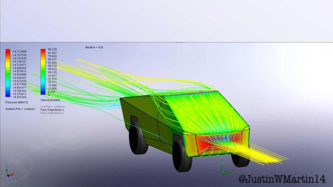 特斯拉Cybertruck发布以来遭到车圈各界的热议,而近日一份由航空领域工程师Justin Martin绘制的特斯拉Cybertruck空气动力学模型图也备受马斯克的注意。为了解特斯拉Cybertruck近乎科幻的特殊造型将带来什么样的风阻系数,Justin Martin通过收集到的资料,绘制其流体力学图并公布于社交媒体,同时肯定了特斯拉为优化该车的空气动力学所做出的努力。马斯克看到该图后也在社交媒体中表示:“特斯拉将会付出极大努力,使Cybertruck的风阻系数尽可能达到0.3Cd,这对于一款皮卡来说是疯狂的,需调整的细节还很多。”从话中我们也可知道,目前Cybertruck的外观并非最终量产后的样子。
