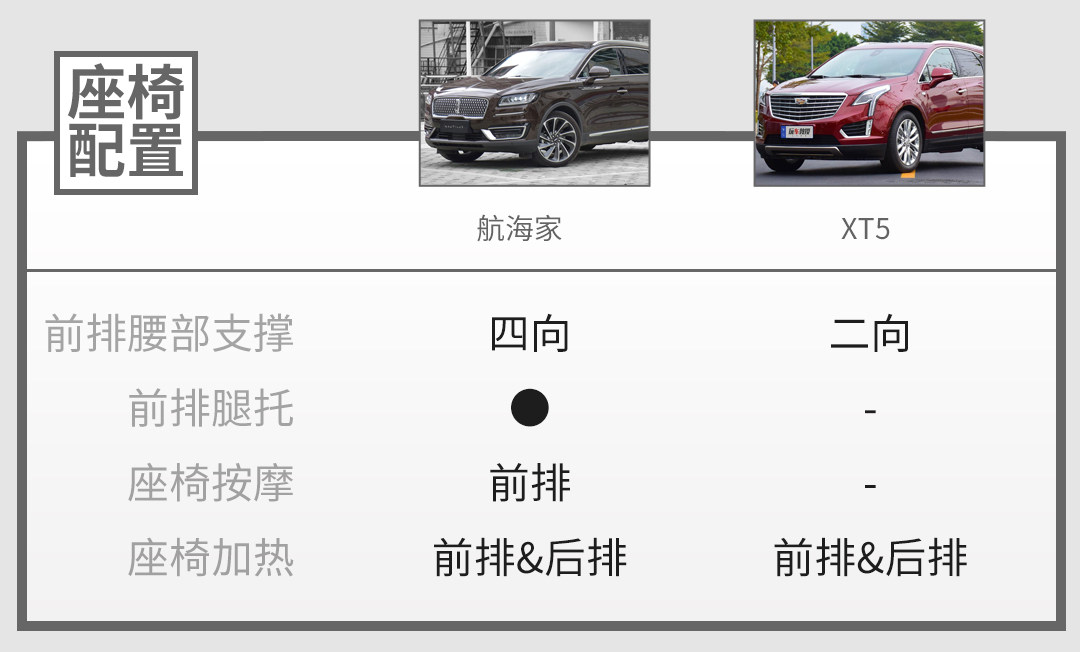 教授此前测试过的车型均为顶配,座椅配置上航海家会更出色,前排座椅腰部支撑支持4向调节,XT5只有2向;两车前后排都有座椅加热的同时,航海家前排还配备按摩功能,舒适性更为出色,其余配置项目基本一致。