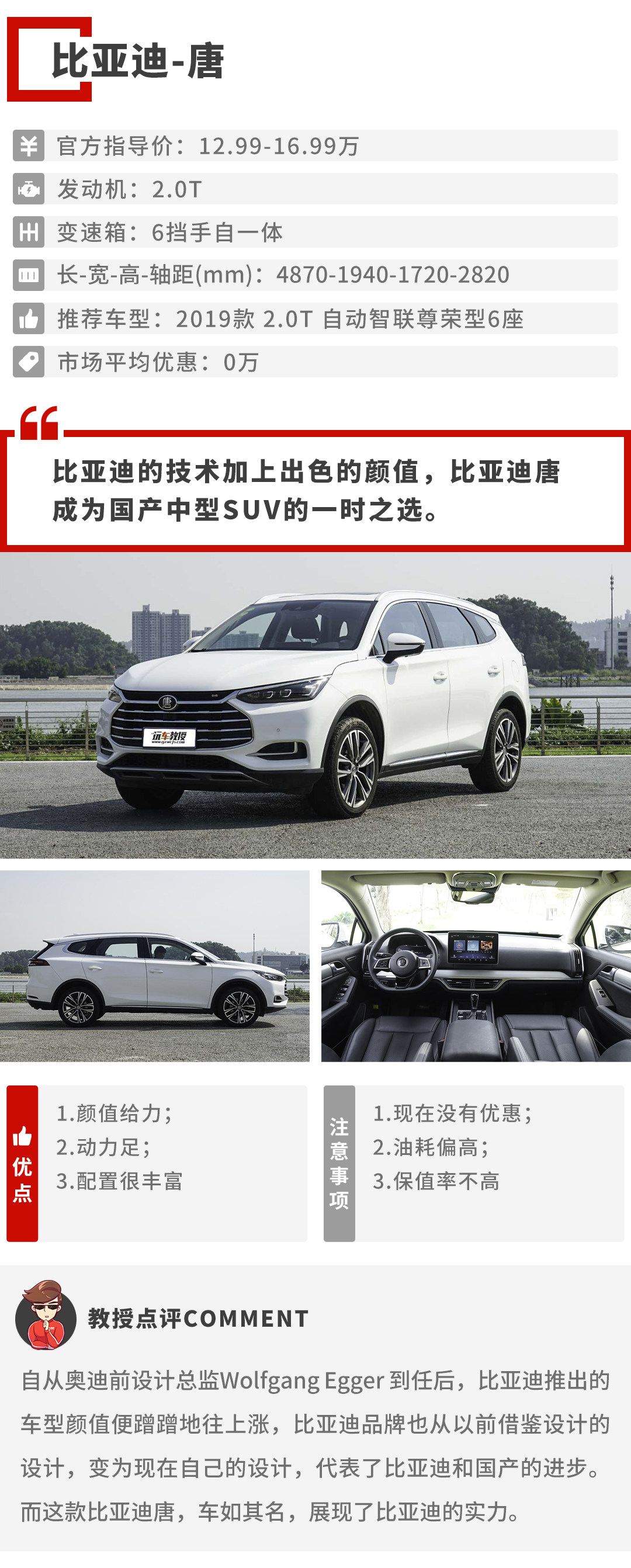 在动力上,比亚迪唐全系标配2.0T发动机值得一个好评,并没有为了拉开高低配价格而采用不同的动力。同时新款比亚迪唐的底盘是由原奔驰S级的底盘调校大师汉斯来调校,经过大师开过光的底盘,自然不会差。在实际行驶中,比亚迪唐的乘坐舒适性也在同级中表现优秀。