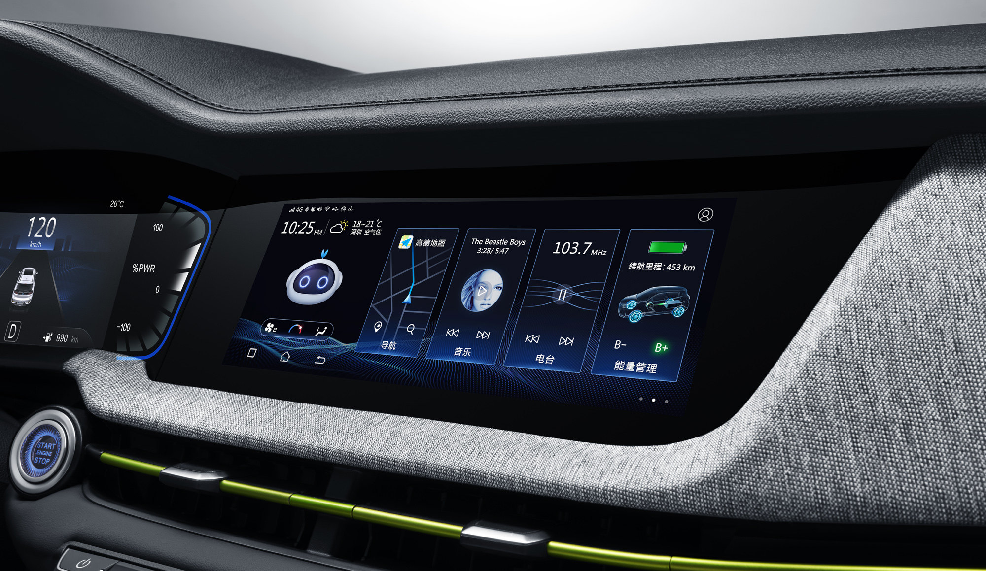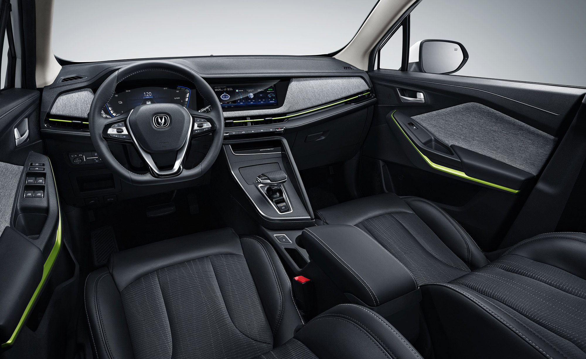 但毕竟是两个不同的“方向”的车型,长安新能源 E-Pro在既有的基础上了进行优化,通过内饰材质与饰条的优化组合,新车在视觉和触摸质感上有了更大发挥的空间。在材质方面,中控台区域大多采用了布艺的面料,触感有了一定提升;而在配色方面上则与外观相为呼应,采用了绿色装饰,颇显年轻化与新能源特色。