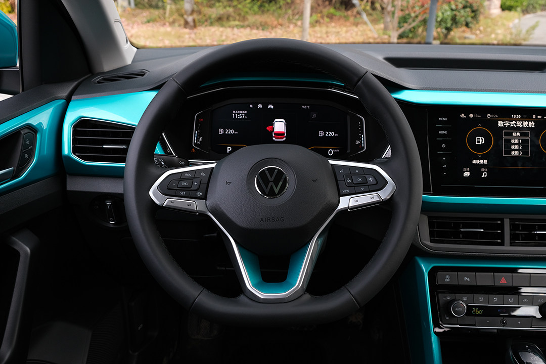 方向盘采用了大众第二代方向盘,按键布局上与第一代不一样,握感上更加厚实,且按键阻尼有所进步。