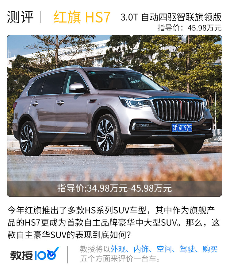 红旗HS系列SUV可以说是近年广受关注的自主品牌新车,其中在今年7月上市销售的HS7更是首款由自主品牌推出的豪华中大型SUV。日前教授拿到了一台红旗HS7 3.0T自动四驱智联旗领版,也就是HS7系列的顶配车型,这一款售价高达45.98万元的豪华中大型SUV,到底会有怎样的表现呢?