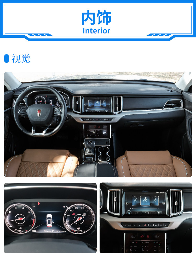 不过,只要打开车门,红旗HS7的内饰一定会让你眼前一亮;中控台造型设计简洁大气,木质饰板和银色金属饰条的使用增强了中控台的层次感;而由全液晶仪表和两块中控触摸屏组成的操作区域科技感强烈,车机系统中的以老电视、收音机、唱片机等为灵感的复古图标也很有特色。