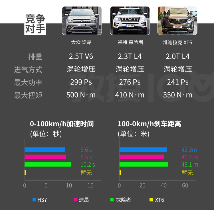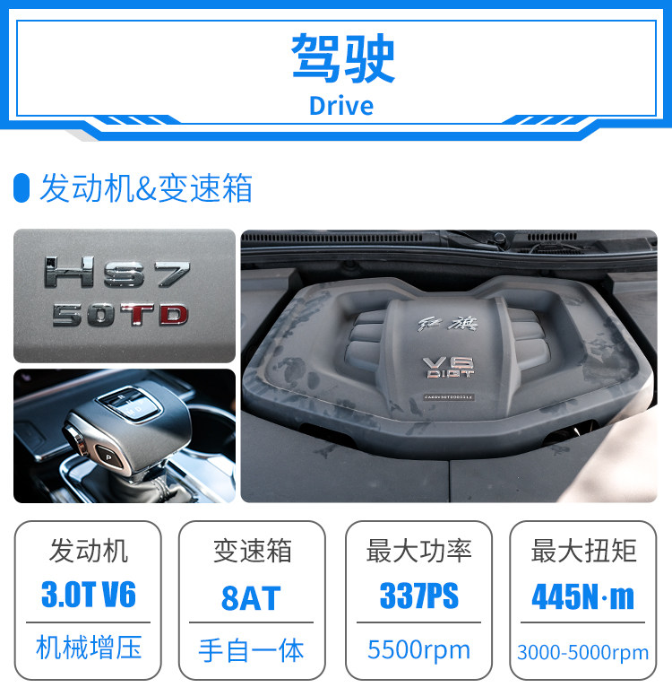 在动力系统方面,HS7全系配备3.0T机械增压V6发动机,可最高输出337匹马力以及445牛·米的扭矩,在这个小排量涡轮增压发动机横行的年代实属少见。在测试中HS7做出了0-100km/h加速8.6秒的成绩,虽然这个成绩在轿车领域并不算十分出色;但是考虑到HS7中大型SUV的身份,其加速性能已经算不错了。