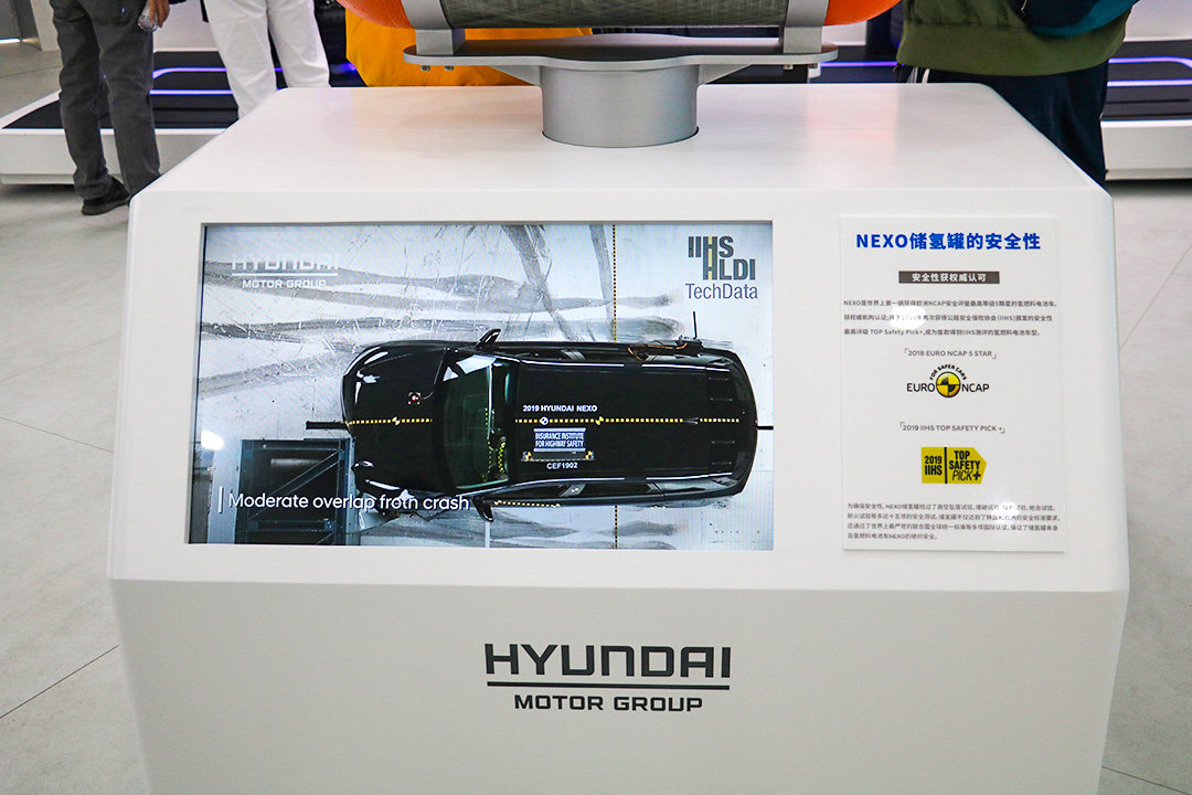 氢燃料电池车驱动原理展示区,现代展出了切割车模型和储氢罐模型,透过模型可直观看到氢燃料电池车的构造、用料组成、驱动原理等。值得一提的是,现代NEXO储氢罐使用碳纤维材料制造,并且采用缓冲碰撞力的装置以及可长时间承受火焰的特殊涂覆技术,顺利通过12000次865bar加氢测试,安全性极高。