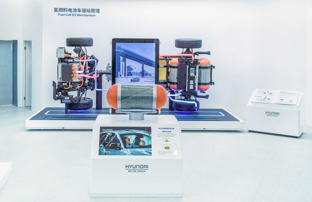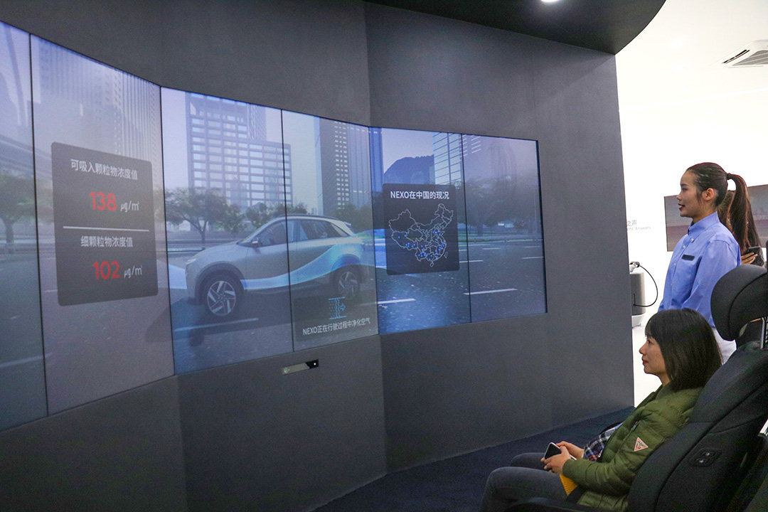 最后是预见氢社会展区和未来移动出行体验展区,前者是展示现代对氢能源在未来社会的多层次应用想象,通过点击LED触控屏幕的不同区域,可分别了解氢能在未来社会的生产、存储、运输和使用方式等;后者现代提供仿真模拟无人驾驶环境,参观者可通过观看视频、动作识别,感受空气净化、便捷充电、氢能共享等生活场景,身临其境般地体验未来移动出行。
