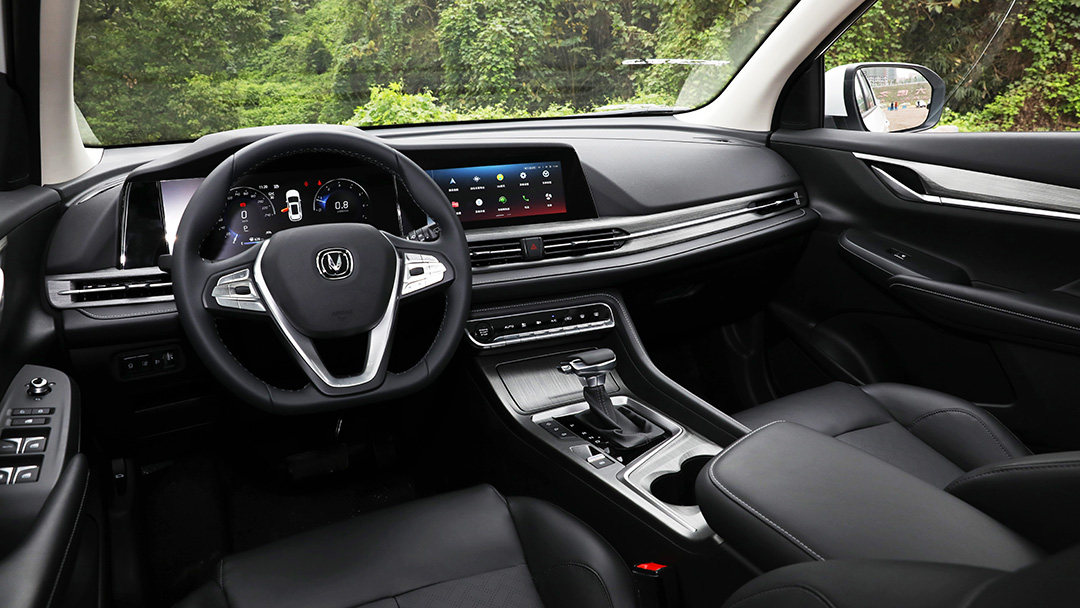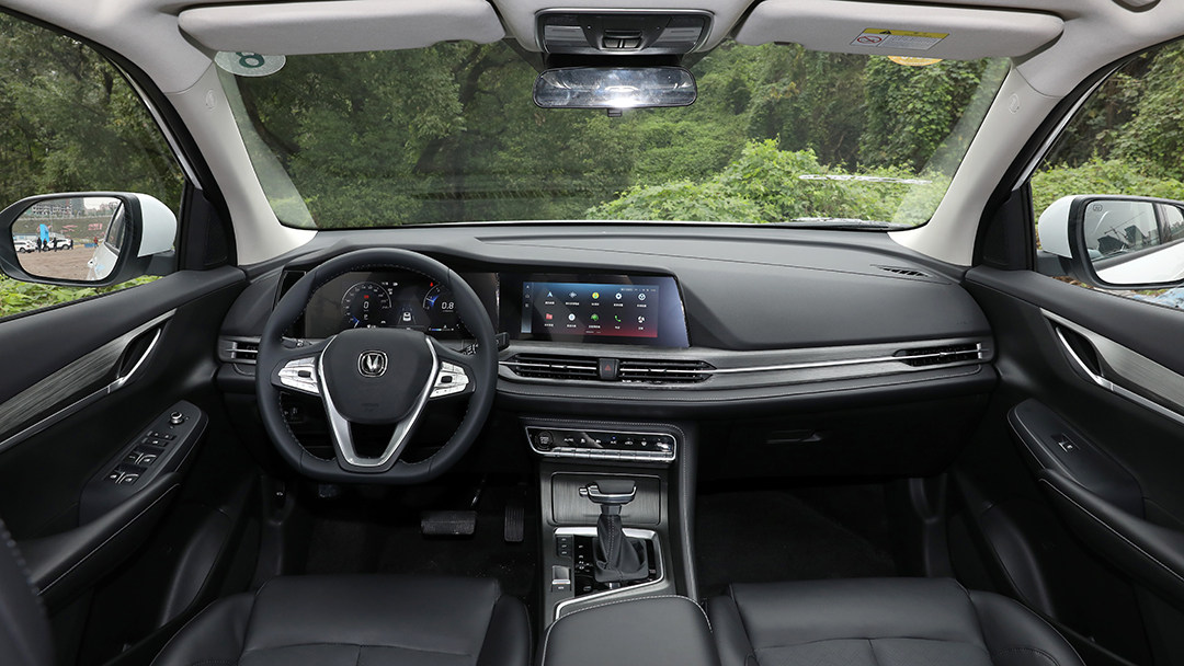 打开车门,长安CS55PLUS的内饰又给教授带来惊喜;虽然设计风格与CS75PLUS相似,但中控台下沿的红色饰条带来了更浓烈的运动感。除视觉效果出色之外,内饰用料也值得点赞;中控台采用了大面积软质材料包裹,用于包裹方向盘的皮质也有着比较柔软细腻的触感。