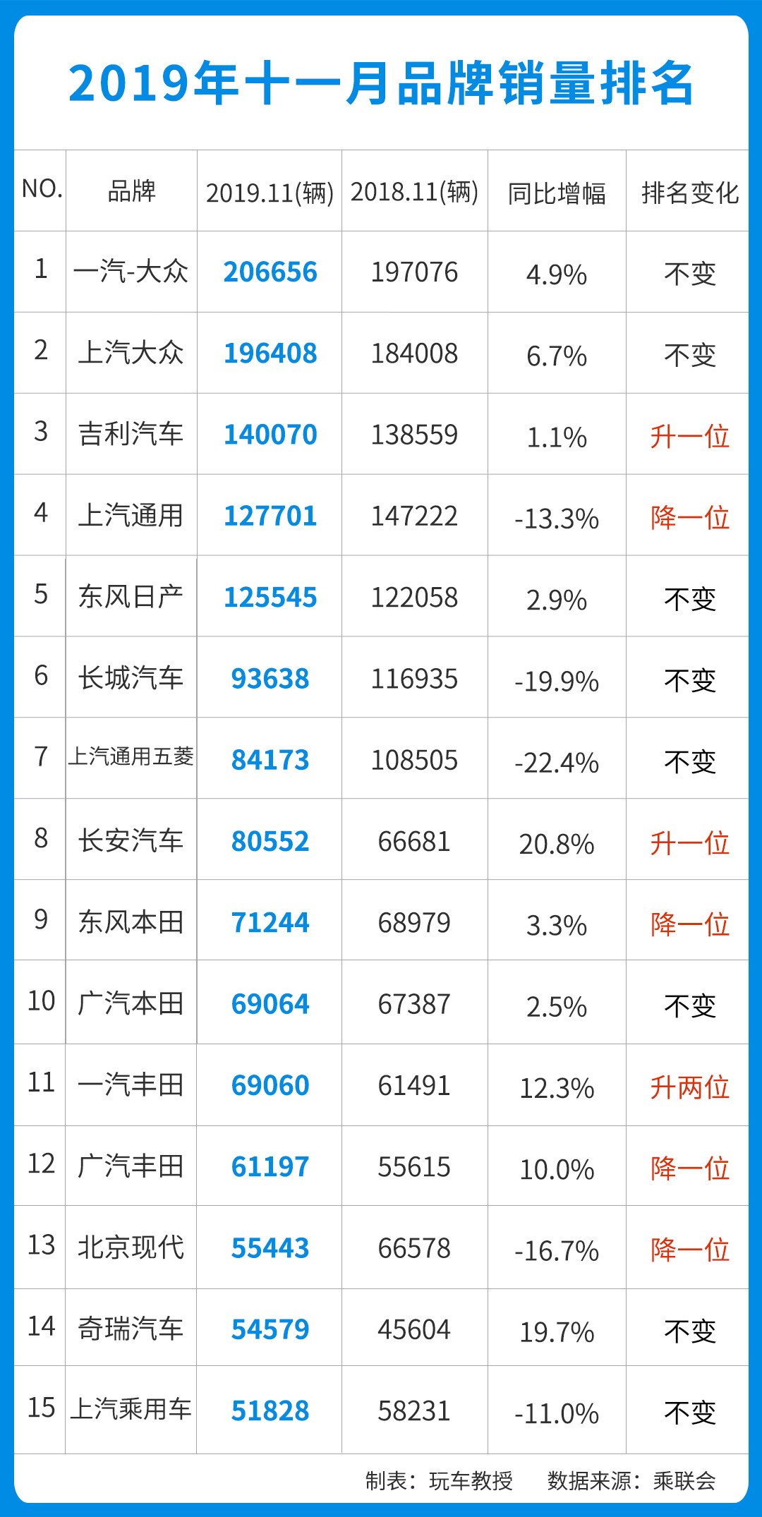 整个11月销量排行前十五位,有五款自主品牌进入傍单:吉利汽车(第三)、长城汽车(第六)、长安汽车(第八)、奇瑞汽车(第十四)、上汽乘用车(第十五)。