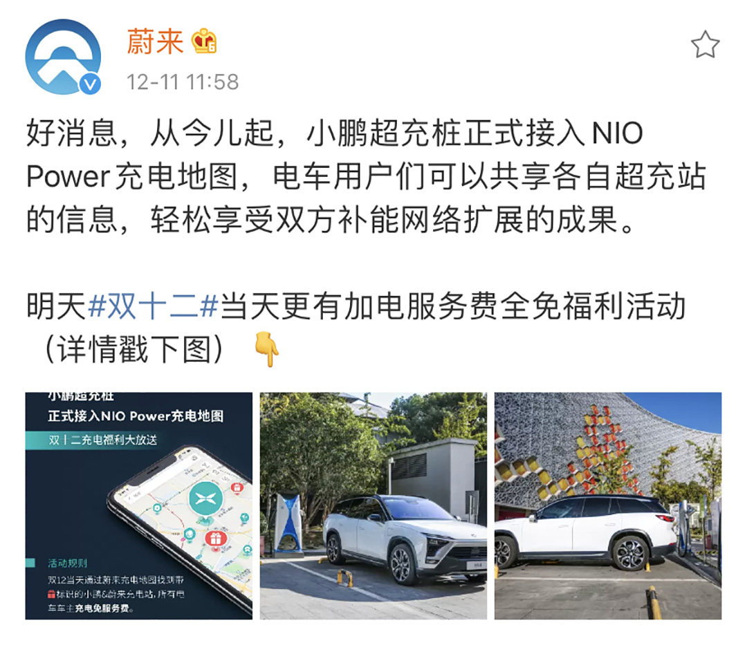 12月11日,蔚来官方发布称:从今日起,小鹏超级充电桩正式接入NIO Power充电地图,电动用户们可以共享各自充电站的信息,享受双方补能网络扩充的成果。此外,官方还表示“双12”(12月12日)当天通过蔚来充电地图找到“小礼物”标识的小鹏和蔚来充电站,所有车主均可享受充电免服务费。续航里程和充电问题一直以来是困扰新能源车主的难题,车企联合建设充电桩的做法,大大方便了车主进行充电服务,同时也将加快新能源汽车普及。