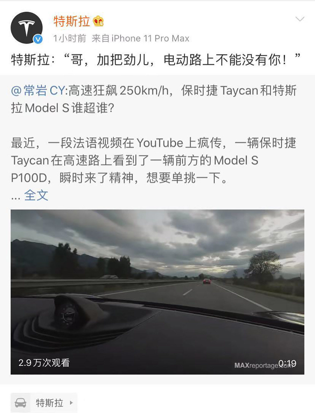 日前,外国汽车博主在YouTube上分享了一段视频。视频中,保时捷Taycan在高速路上看到了一辆前方的Model S P100D,瞬时来了精神,想要单挑一下。只见Taycan时数达到了250km/h,触发了续航预警,Taycan马上就在一个高速匝道口下去了,大家期待中的热血场面没有到来。视频也被特斯拉官方微博转发,还调侃到:“特斯拉:“哥,加把劲儿,电动路上不能没有你!” 今年8月底,特斯拉Model S在纽北跑出了7分23秒的圈速成绩,一举超越保时捷Taycan成为纽北最速四门电动车。虽然特斯拉成绩更胜一筹,不过如果让我在两车之间选择,教授会毫不犹豫地选择保时捷Taycan。