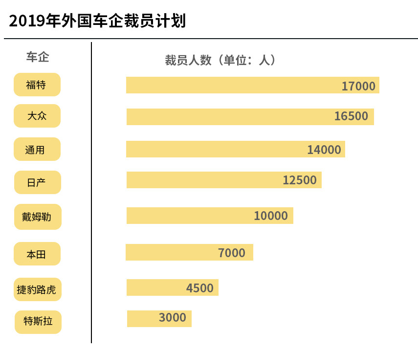 而这只不过是汽车行业寒冬的一个缩影,福特、通用、日产均在今年宣布了不同程度的裁员计划。