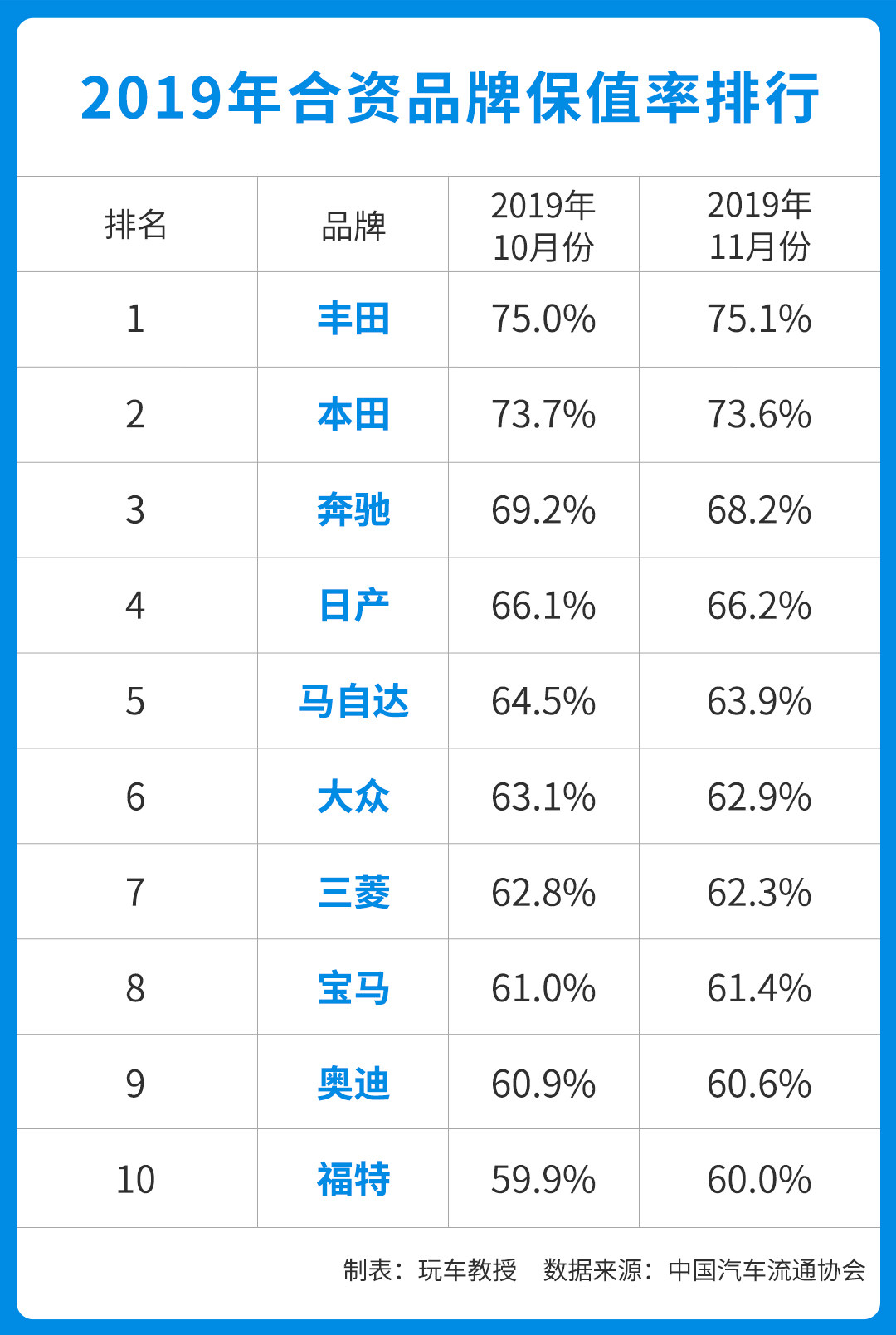 最新的合资品牌保值率数据出炉,我们可以看到排在前十位的都是我们熟悉的品牌,包括丰田、本田、日产、马自达、大众、宝马、福特等,其中以11月保值率来看,丰田高居榜首,保值率高达75.1%。