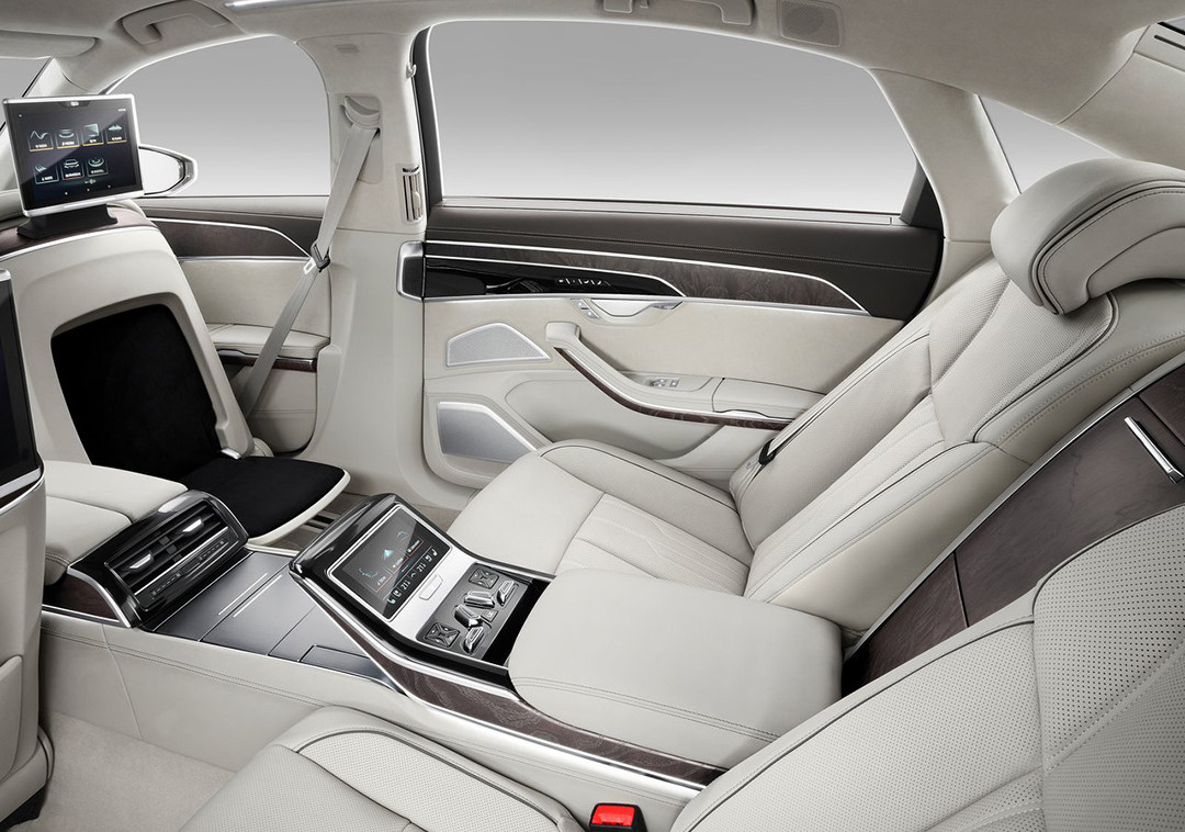 当然,A8的后排同样拥有舒适的乘坐环境,后排座椅的扶手上安装了一个可拆卸的平板电脑,可控制座舱温度、音响、环境照明、隐私窗饰以及座椅温度。