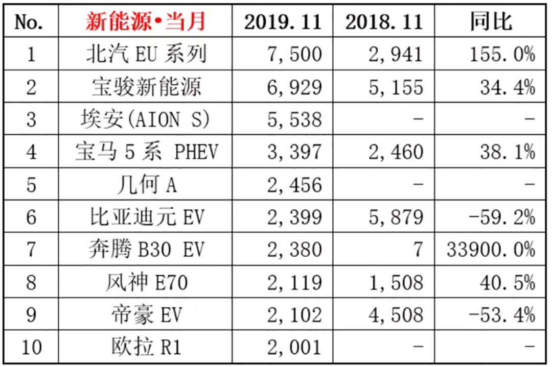 日前,乘联会公布了11月份的新能源汽车销量榜单。在前十名当中,北汽EU系列斩获7500辆,同比实现155%增长,获得11月新能源汽车销量冠军的席位,同时也提前锁定2019年新能源汽车销量冠军。宝骏新能源排在第二位,广汽新能源AION S 凭借在个人市场以及网约车市场的发力排在第三名。数据显示,11月新能源乘用车批发销量7.9万辆,同比下降40%,业内人士分析,销量低迷依然是退坡之后销售成本大幅上涨的影响,同时国六插混的扰动也是影响因素之一。