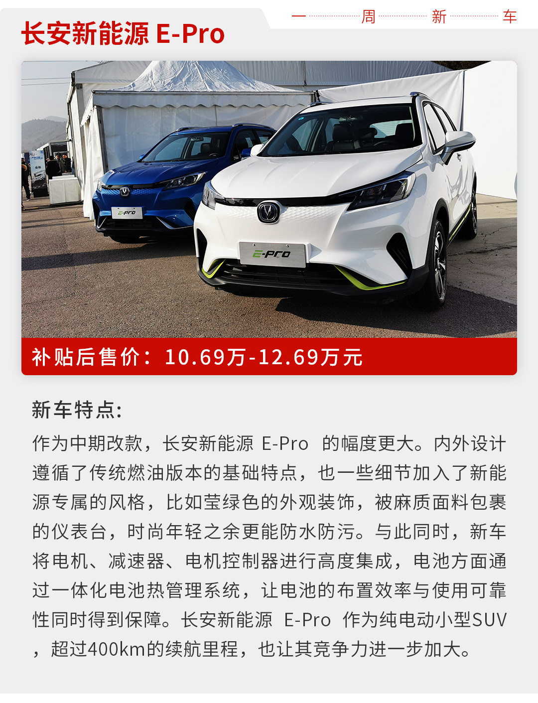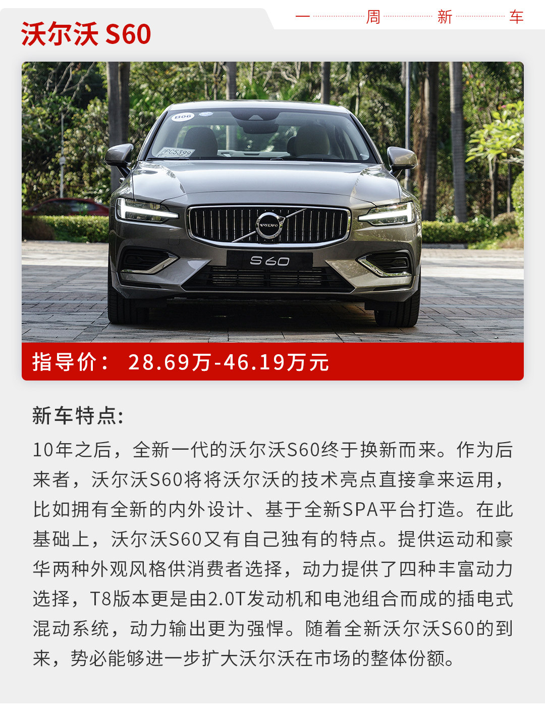 延续了上周的情况,本周上市车型依然没有那么多,比较重磅的新车主要有全新沃尔沃S60和的长安新能源 E-Pro。全新沃尔沃S60的加入,也意味着中型豪华轿车又进入了更为激烈的竞争阶段,特点鲜明的它能否后来居上呢?而长安新能源 E-Pro ,避开了纯电动小型SUV的短板,本周新车如何?闲言少叙,书归正传,马上开始本周的一周新车时间。