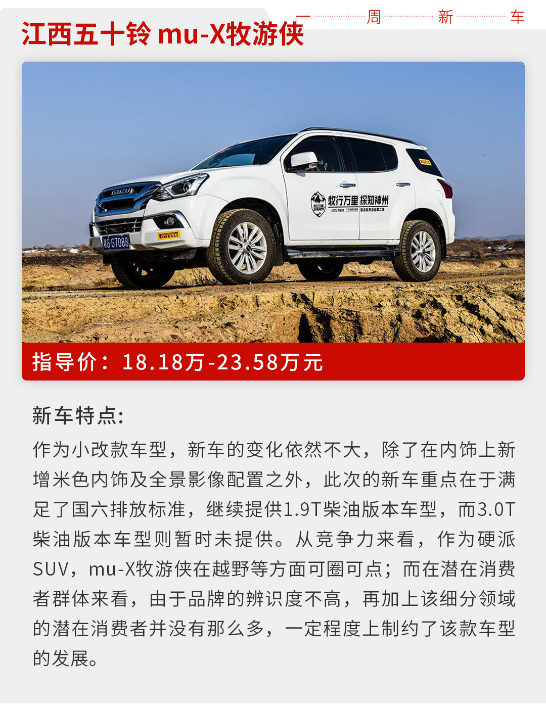 本周上市的主要新车,虽重磅新车数量不多,但全新沃尔沃S60 的上市,依然让本周新车关注度变得颇高。在中型豪华轿车领域上,各大车企都有自己强有力的车型,虽然沃尔沃S60特点鲜明,但压力依然不小。而内外设计方面有了更加精致特点的长安新能源 E-Pro,同时拥有超过400km的续航里程,也能很好的满足绝大部分消费者通勤需求。捷途X70M和mu-X牧游侠则在一定程度上提升综合竞争力,但优势不明显。
