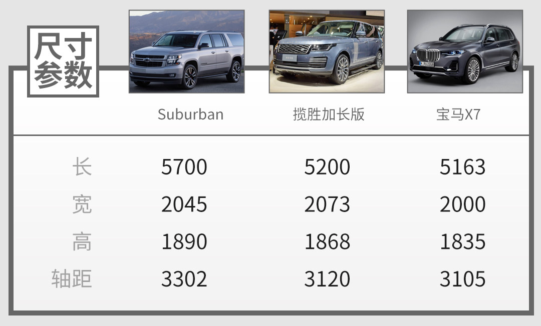 作为一款全尺寸SUV,我们先说说Suburban的车身尺寸,官方还没发布13代车型的具体尺寸(只说Suburban和Tahoe车长分别增加了1%和4%不到),我们先拿12代车型的尺寸作一些比较,即便是上一代车型的Suburban,车长就已经达到5.7米,宽度超过2米,揽胜加长版、BBA最新的大型SUV在它面前就是个弟弟。