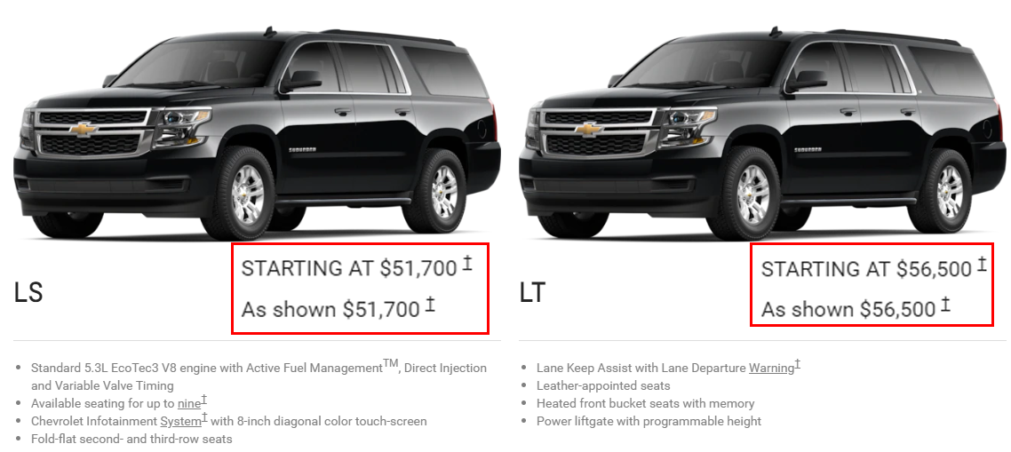 这么大的一辆车,在美国卖多少钱?还是拿12代车型做比较,分为LS、LT、Premier,可以理解为低中高配,发动机有5.3L V8和6.2L V8,美国雪佛兰官网最便宜的LS车型起步价是5.17万美元;而Tahoe,是尾厢比Suburban小一点的姊妹车型,起步价则是4.9万美元。