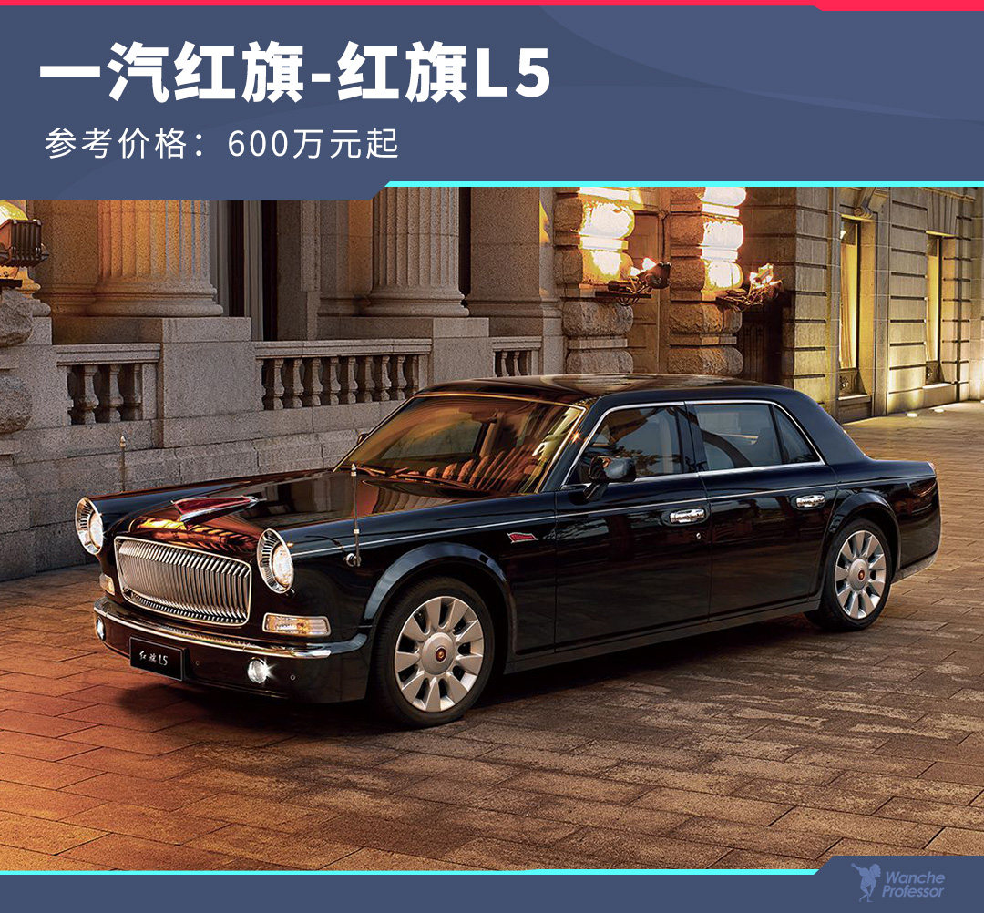 红旗L5是基于红旗L平台产品开发及生产准备后打造的一款100%自主知识产权的E级轿车。外观传承红旗CA770的设计,内饰布局则选用传统的“如意”为主题,并且采用非物质文化遗产——沈氏大漆工艺。此外,类似“小如意”的前后车门四个把手均镶嵌一块云龙纹白玉,怎豪华了得。并且由于曾经为元首服务的显赫地位,在购车环节设置了严密且繁复的审核流程,如果审核不过关,就算阁下再有钱也无法成为L5的车主。