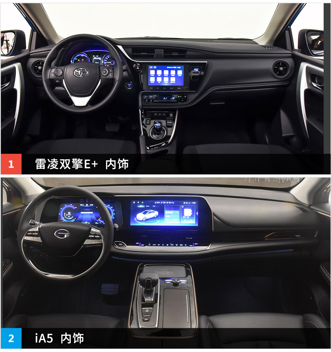 首先在外观上来看,两台车的设计并没有任何的关系,雷凌双擎E+就像是上一代雷凌双擎作出了一点改变, 把原有的镀铬饰条进行了黑化处理,让整台车在外观上看起来更显年轻,除此以外你很难发现双擎E+跟双擎在外观上的区别。至于iA5,你会发现其实跟广汽传祺的Aion S如出一辙,但是你又会发现似乎又有哪里不一样,车尾没有了贯穿尾灯,前脸又没有了贯穿饰条,其实这在很大程度上是源自于Aion S的入门版车型。同时你会发现,iA5的车标是挂着广汽集团的logo,而并不是挂丰田标,要是把车尾的标识盖住了相信你也很难分辨出来这是iA5还是Aion S。