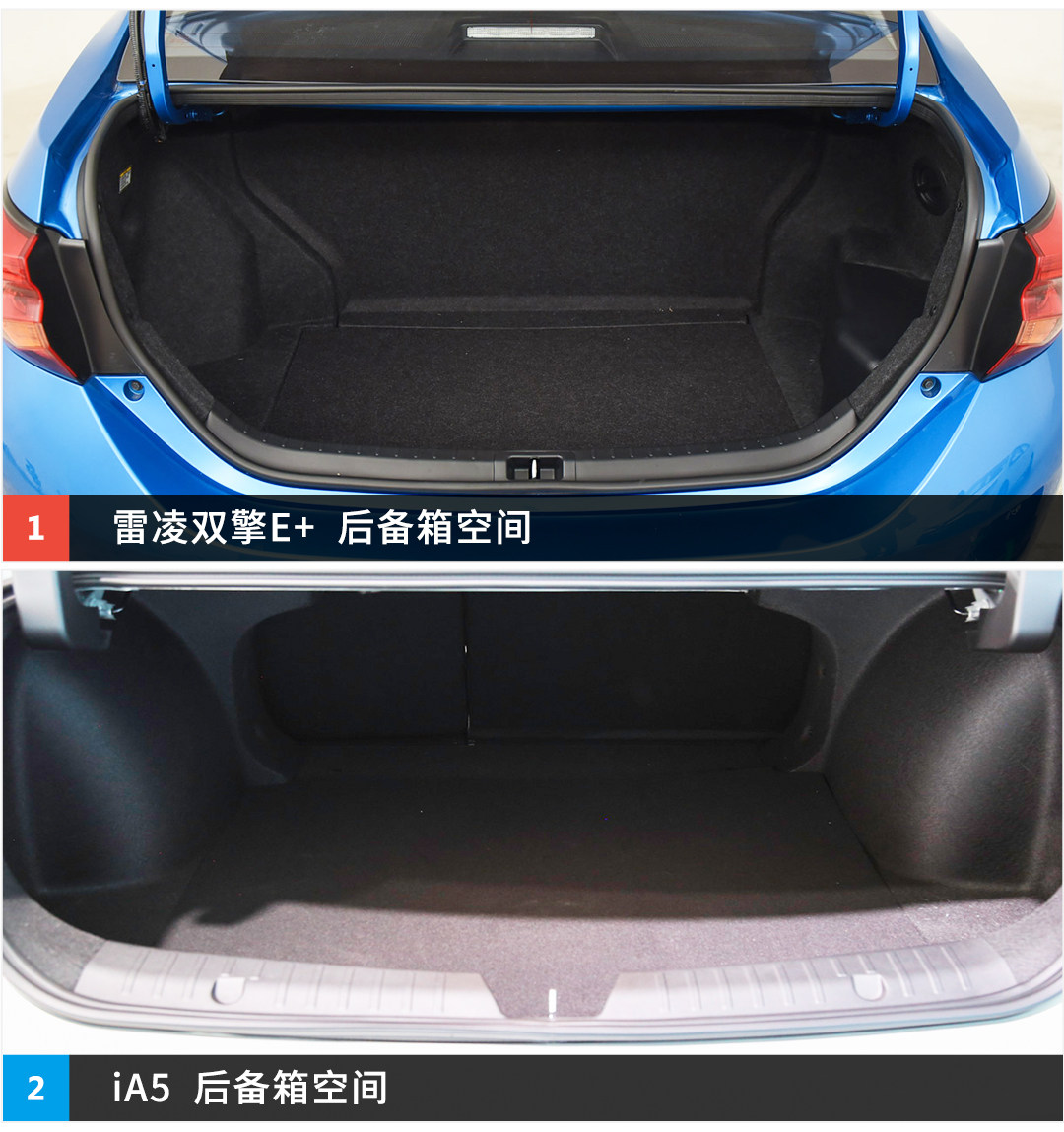 说到这里,教授就不得不提一下两车的后备箱表现了,iA5由于是基于纯电平台打造的车型,所以尾箱并没有受到电池组的影响,基本能达到一辆紧凑型车该有的表现,并且后排座椅可以进行放倒。而在双擎E+上,尾箱空间几乎就是一辆小型车甚至是微型车的表现,并且座椅并不能进行放倒。