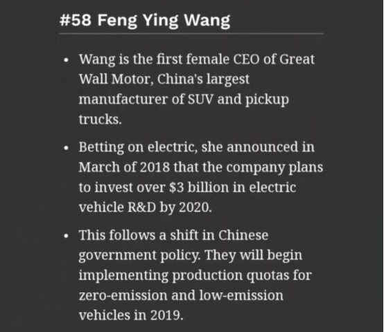 长城汽车总裁王凤英入选福布斯“2019年全球100位最具影响力女性榜单”