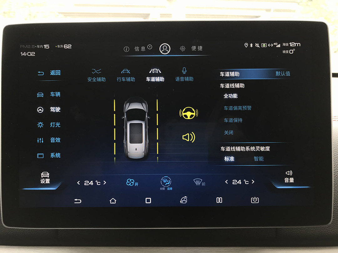 在经过一段时间升级后,我们能看到从原来的三个选项已经变成了多了,多出了一个车道辅助功能。当车速大于60km/h时,如果车辆行驶偏离自己的车道,且没有打转向灯,系统首先会发出警告提示。如驾驶员没有回应,系统将通过 EPS 电子转向系统在方向盘上施加力矩,使车辆保持在自车车道内,减轻驾驶员的转向负担。而在这个过程中,如果驾驶员打方向灯或者大角度转动方向盘,则系统默认车辆由驾驶员接管而停止干预,而当车速小于55km/h时主动式车道保持系统则退出。
