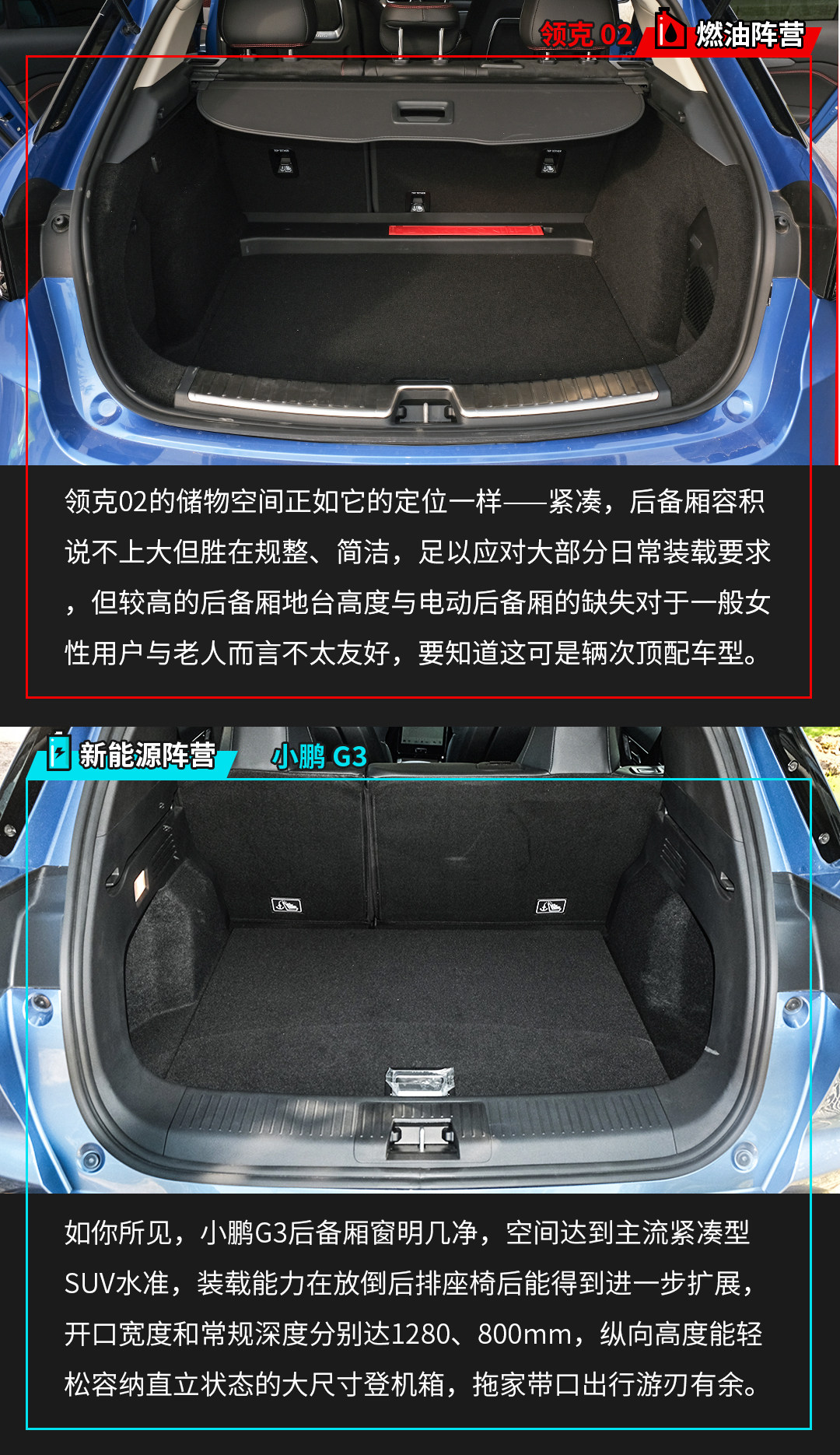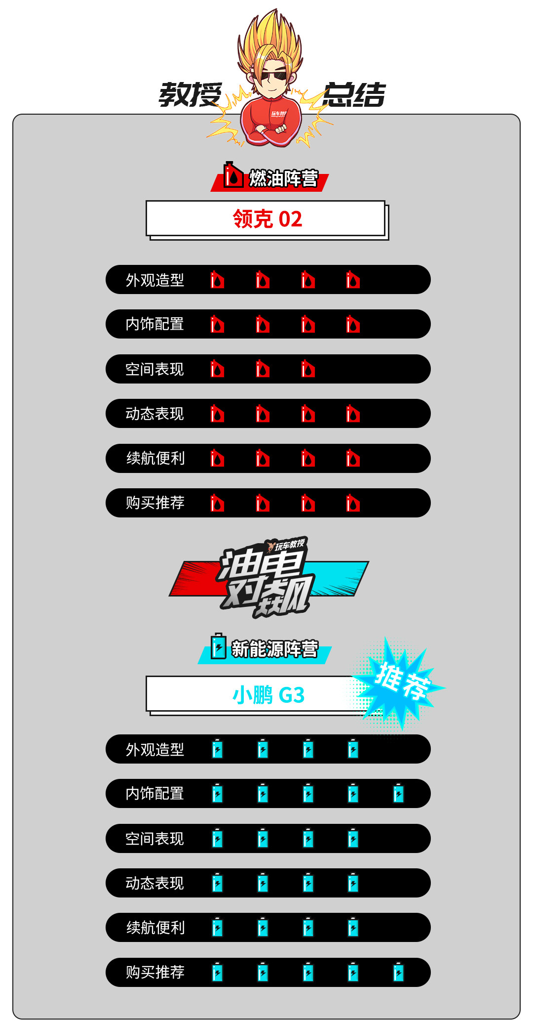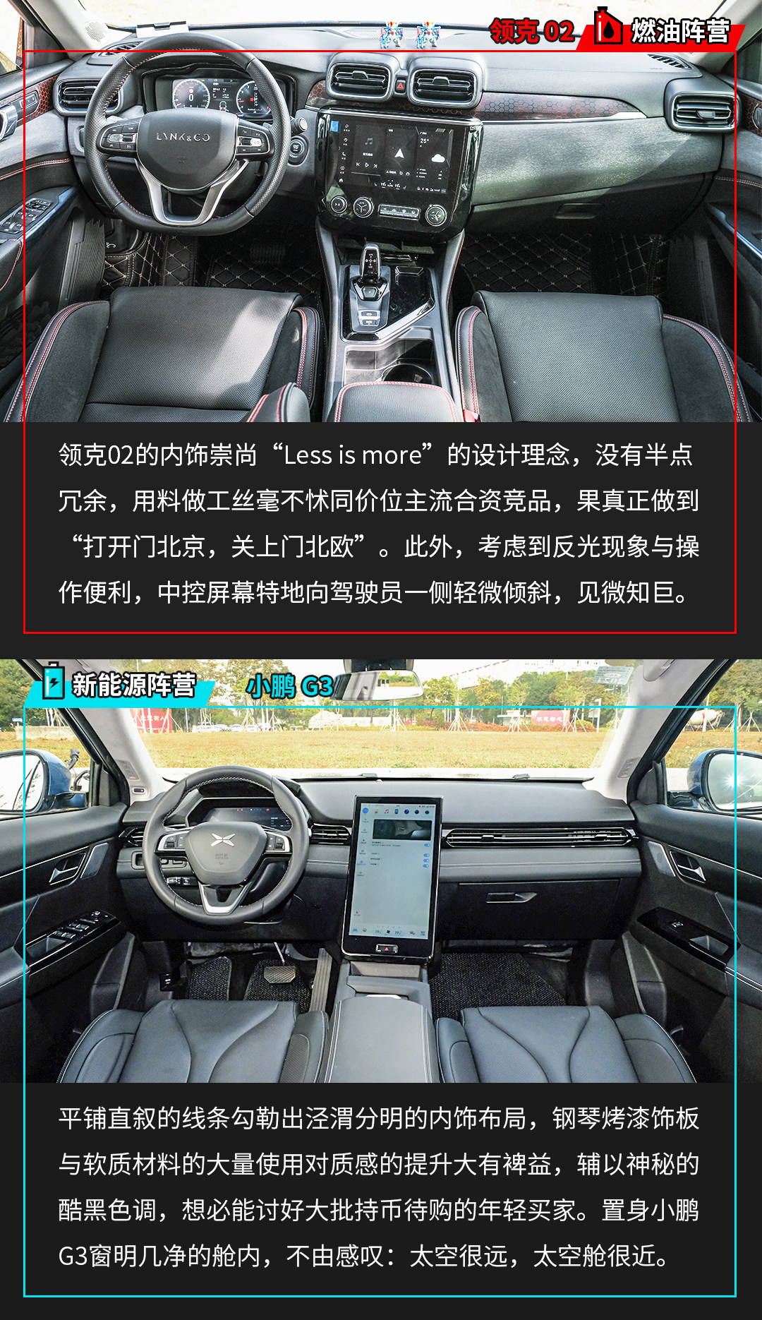 本次对比的两款车型落地价均为20万元左右,追求个性、亟需一款的特立独行车型去拓宽个人社交圈子的用户,不妨选择别出机杼的领克02,但前提是你得接受它在实用性和配置体验上的不足;另一厢,小鹏G3凭借拔群的科技属性、不俗的空间实用性收获较广受众面,无论是科技极客、斜杠青年,抑或顾家暖男、知性大妈,开着小鹏G3都不显违和。