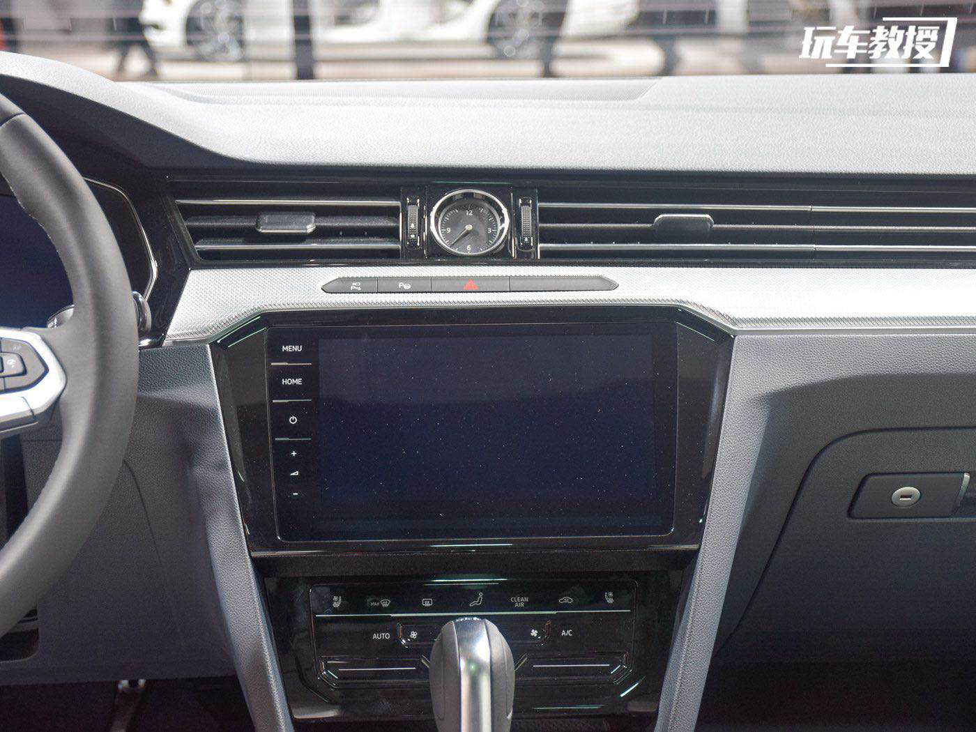 新迈腾的内饰布局没有发生变化,平整的T字中控台,带有镶嵌时钟的贯穿式空调出风口,而中控台主要的升级在于空调区域采用了触摸式调节面板,科技感更强烈。