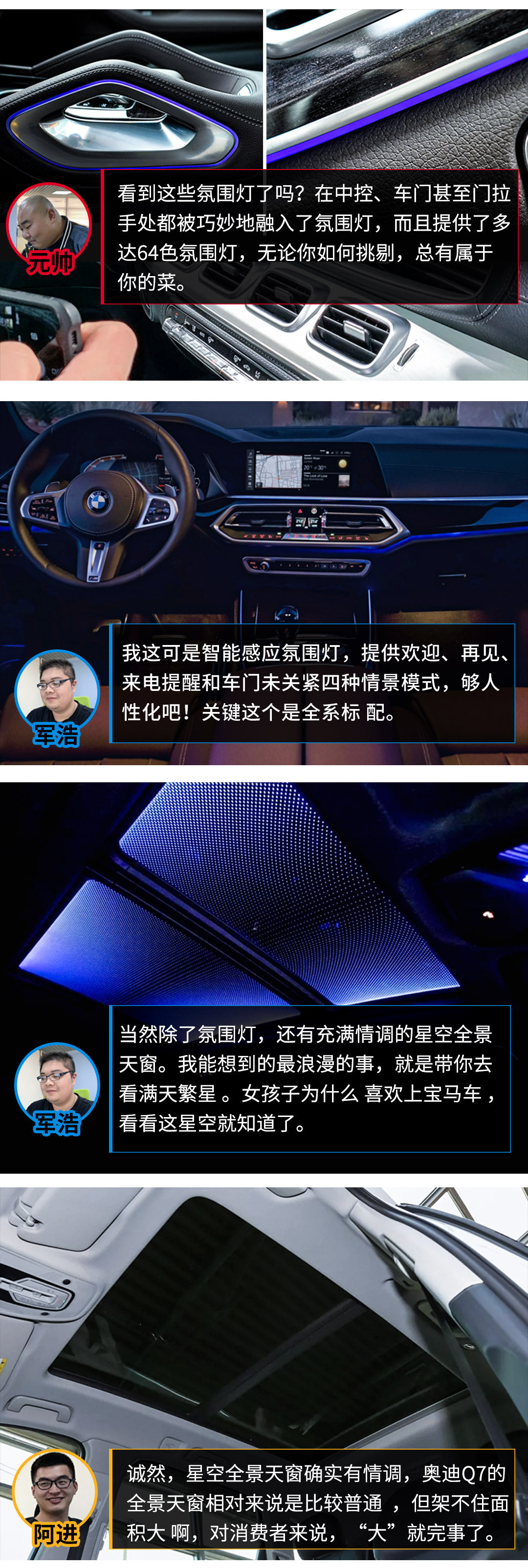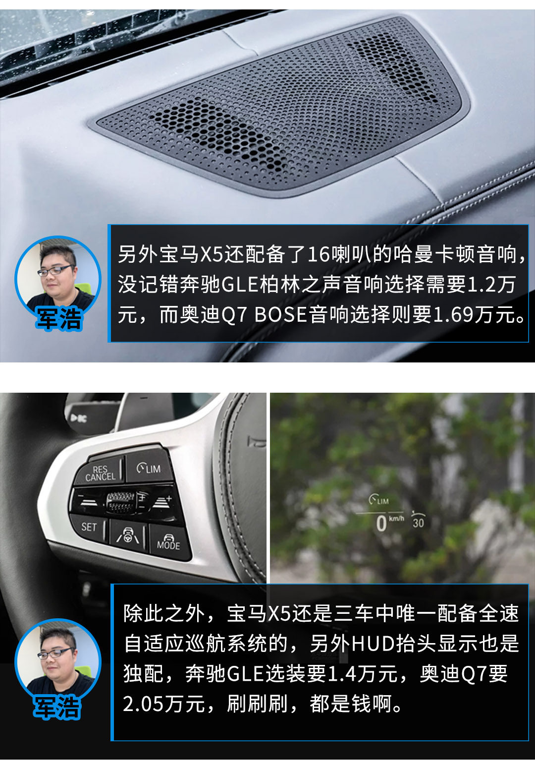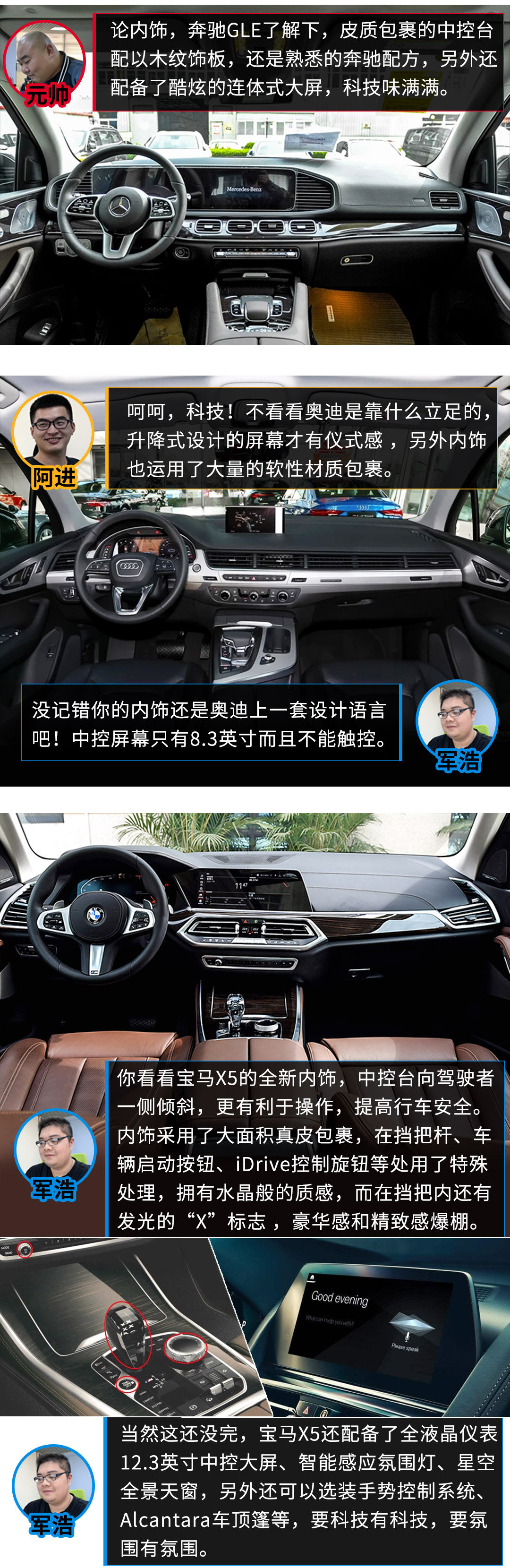 所以从内饰配置来看,奔驰GLE依旧保持着豪华的风格;奥迪Q7虽然还是奥迪上一套设计语言,但科技感放当前来看仍不落伍;而宝马X5终于开始在被人诟病的内饰上奋起直追,全新的内饰相比以往有着明显的进步,细节的处理展现出十足的精致感,而大面积真皮包裹则营造出更强的豪华氛围,当然让人称赞的还是宝马X5更加厚道的配置。