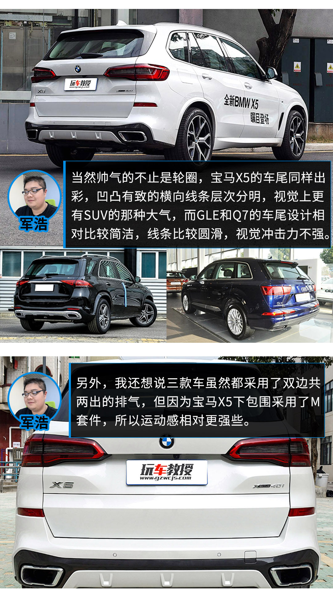 总的来说,从外观设计上来讲,全新换代的宝马X5和奔驰GLE会比还未换代的奥迪Q7给我们带来了更多的新鲜感,其中宝马X5因为采用了M运动套装,视觉效果会更抢眼。另外宝马X5配有激光大灯,且轮圈为21英寸,其他两车想要更高级的大灯效果和更大尺寸轮圈则需要选装。