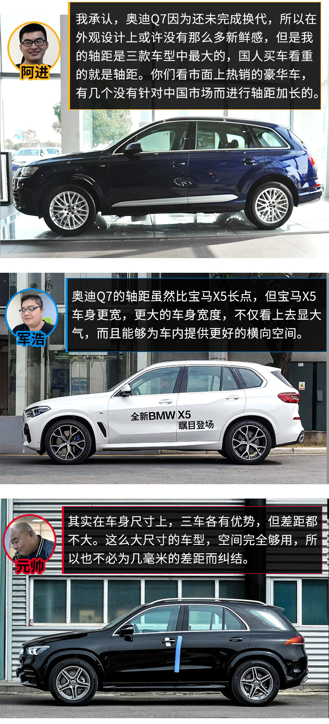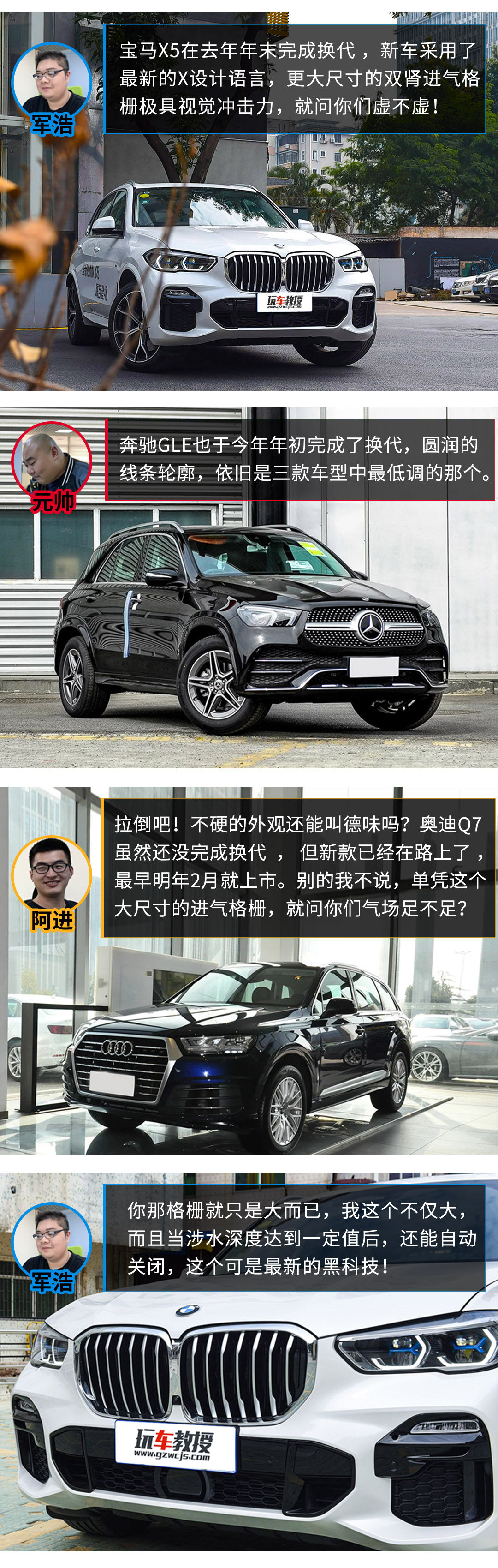 经过一番简单的交流后,三位热心的同事分别为“俊哥”推荐宝马X5 2019款 xDrive40i 尊享型 M运动套装(84.99万)、奥迪Q7 2019款 55 TFSI S line运动型(83.98万)和奔驰GLE 2020款 450 4MATIC 时尚型(84.38万),三款车售价接近,但又各有特点,究竟谁才是最具“德味”的那款,接下来看看编辑们如何推销“自己的”产品。