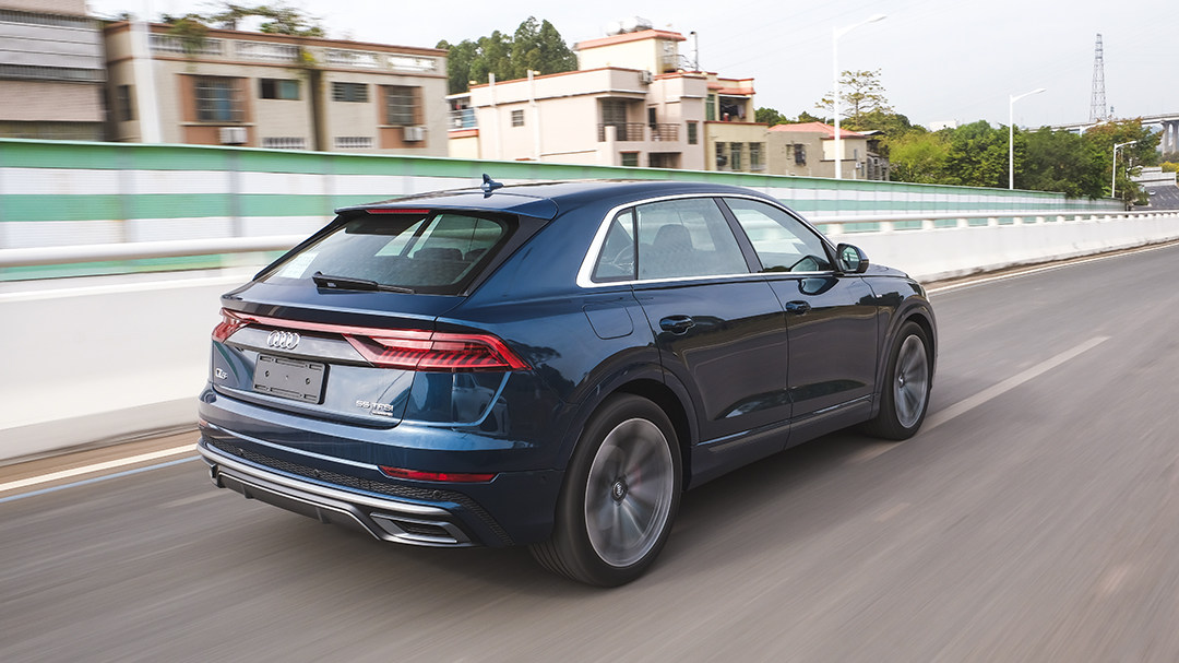 “溜背”是Coupe SUV的标配,Q8当然也是如此;尽管奥迪可能为了给后排乘客留下更宽广的视野,以免他们在车主的激烈驾驶中更容易晕车而没有追求夸张的顶部下倾角度,但在锐利且富有雕刻感的车身线条衬托下,Q8的侧面造型显得尤为修长、紧凑。