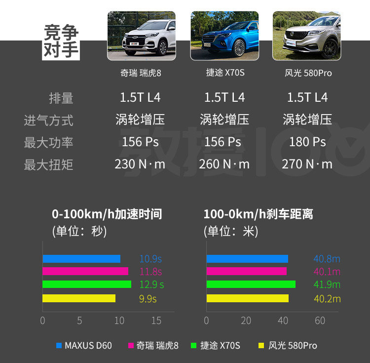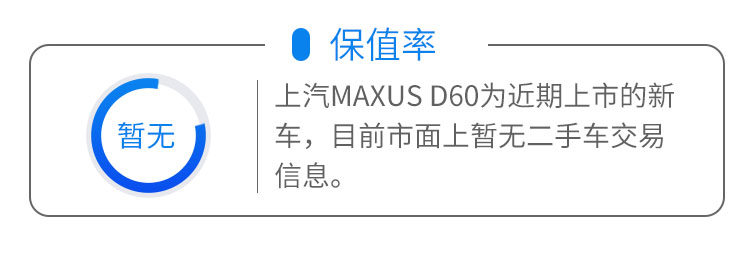 在测试中上汽MAXUS D60做出了0-100km/h加速10.9秒的成绩,而在100-0km/h的刹车成绩中,上汽MAXUS D60的成绩为40.8m。虽然这两个成绩在SUV领域并不算十分出色,但是考虑到上汽MAXUS D60是一辆中型SUV,其性能已经算不错了。