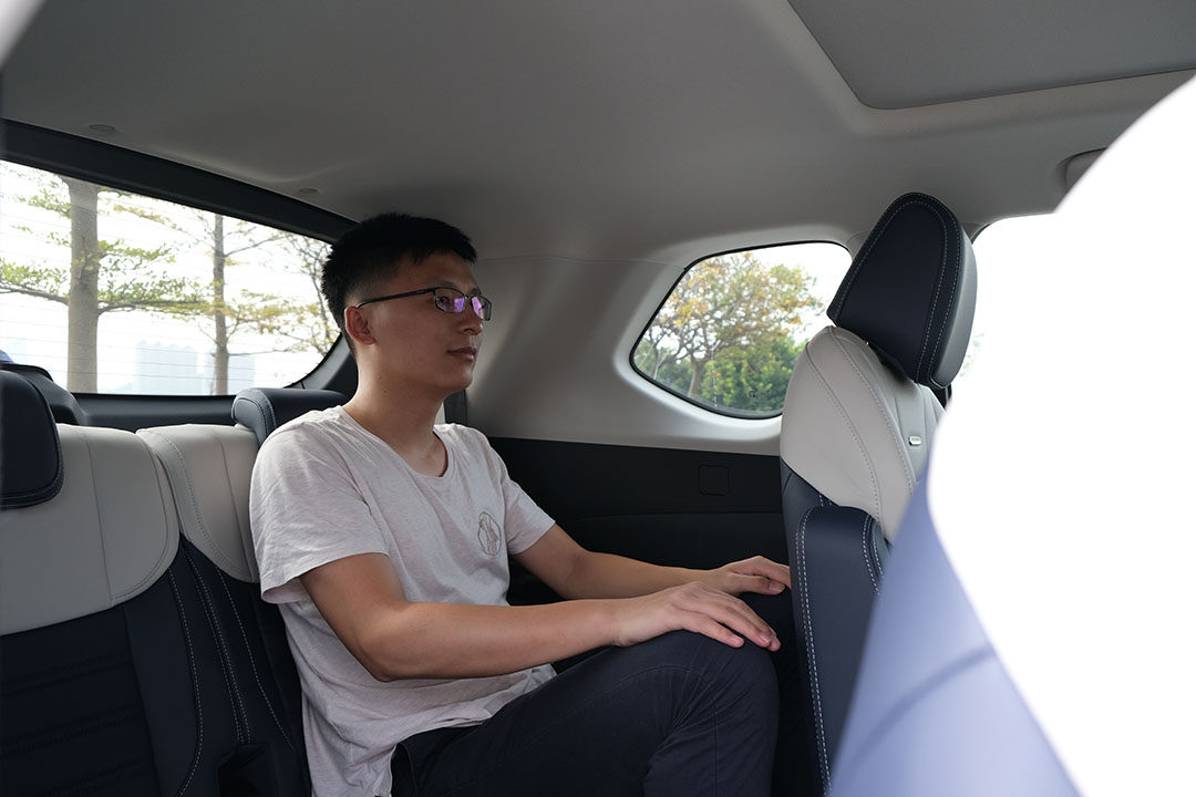 关于第三排空间如图所示,身高为178cm的体验者坐上去之后,腿部空间还有不到一拳的距离,第三排的座椅高度偏低,只适合短途出行。当然如果是个子娇小的乘客坐第三排,D60的空间那么相对来说还是可以乘坐较长时间而不会感到不适的。
