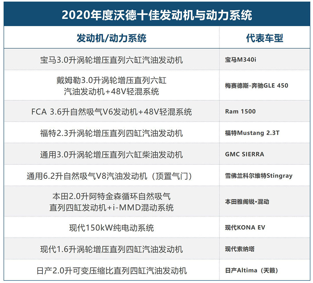 沃德十佳发动机评选在1994年开始评选,于每年年末发布,旨在通过对美国本土销售的车型进行长时间日常驾驶以及测试后,根据不同的排量、动力参数、技术特性在实际用车中表现的结果进行评估,综合选出其中十台最佳发动机。这个评选结果在世界范围内都有较大的影响力,对于消费者购买车型有一定的指导意义。