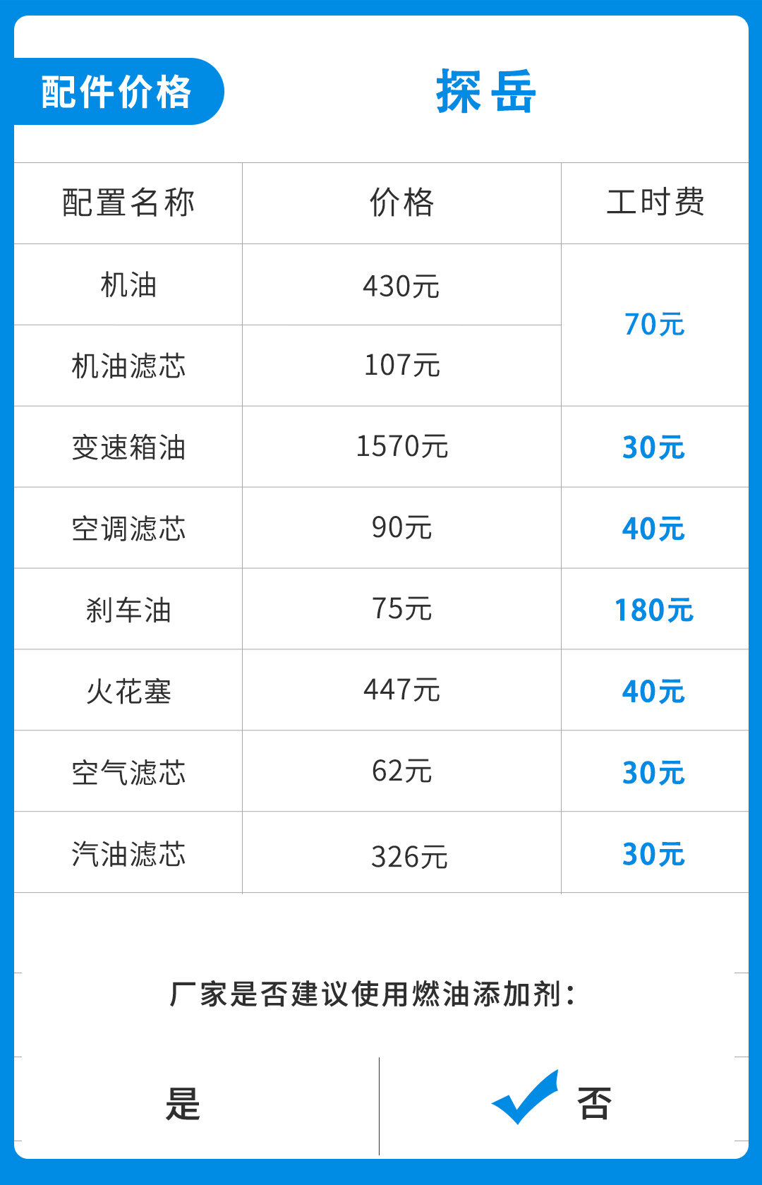 从保养配置表来看,采用EA888 2.0T发动机的探岳,采用全合成机油,每次保养需要6L左右,所以光机油就要430元左右,费用并不便宜,另外工时费因地区和4S店而定,数据仅供参考。