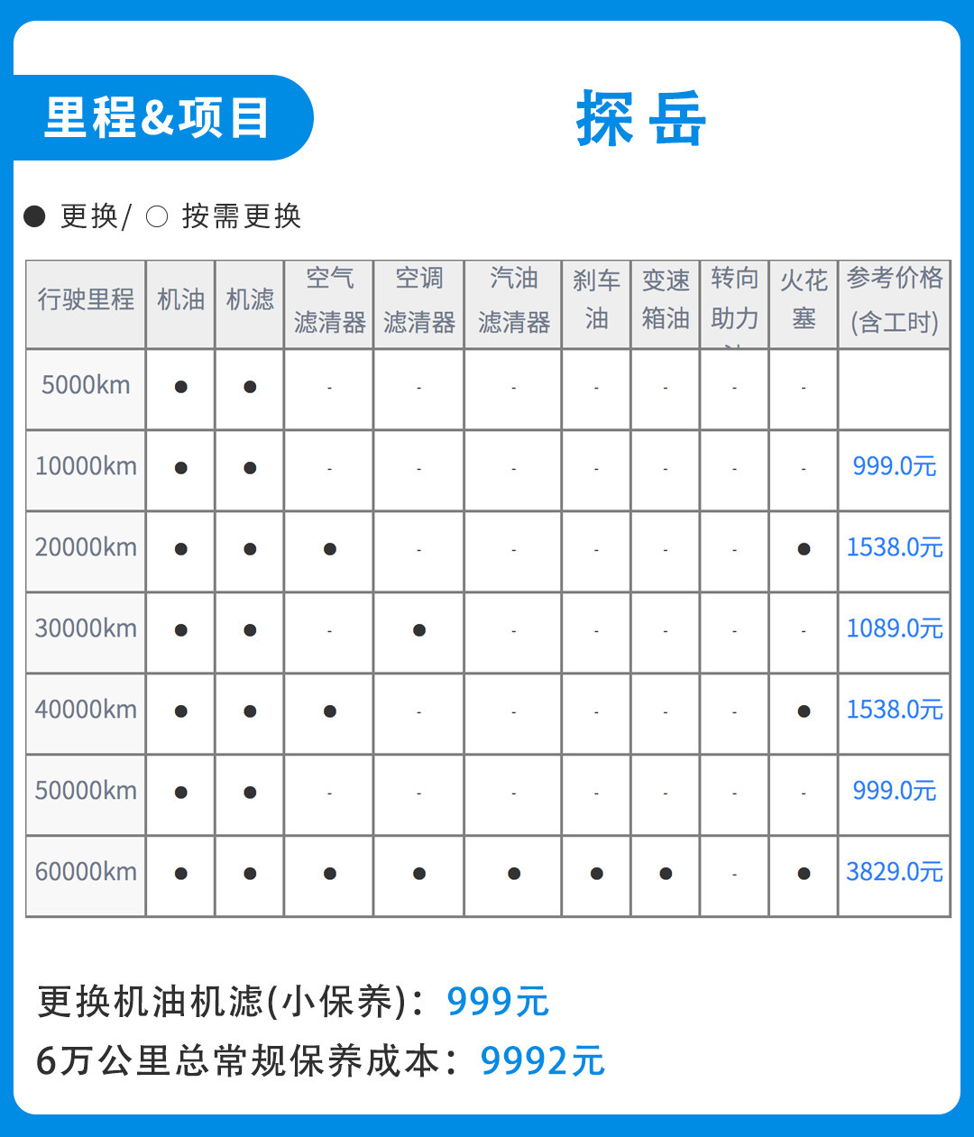 按照厂家建议,探岳每6个月或10000公里保养一次(先到为准),其中首保免费,小保费用990元左右,而像6万公里的大保养则要花费3829元。按3年6万公里计算,总保养费用约为9992元,平均每年3330元,平均每月278元。