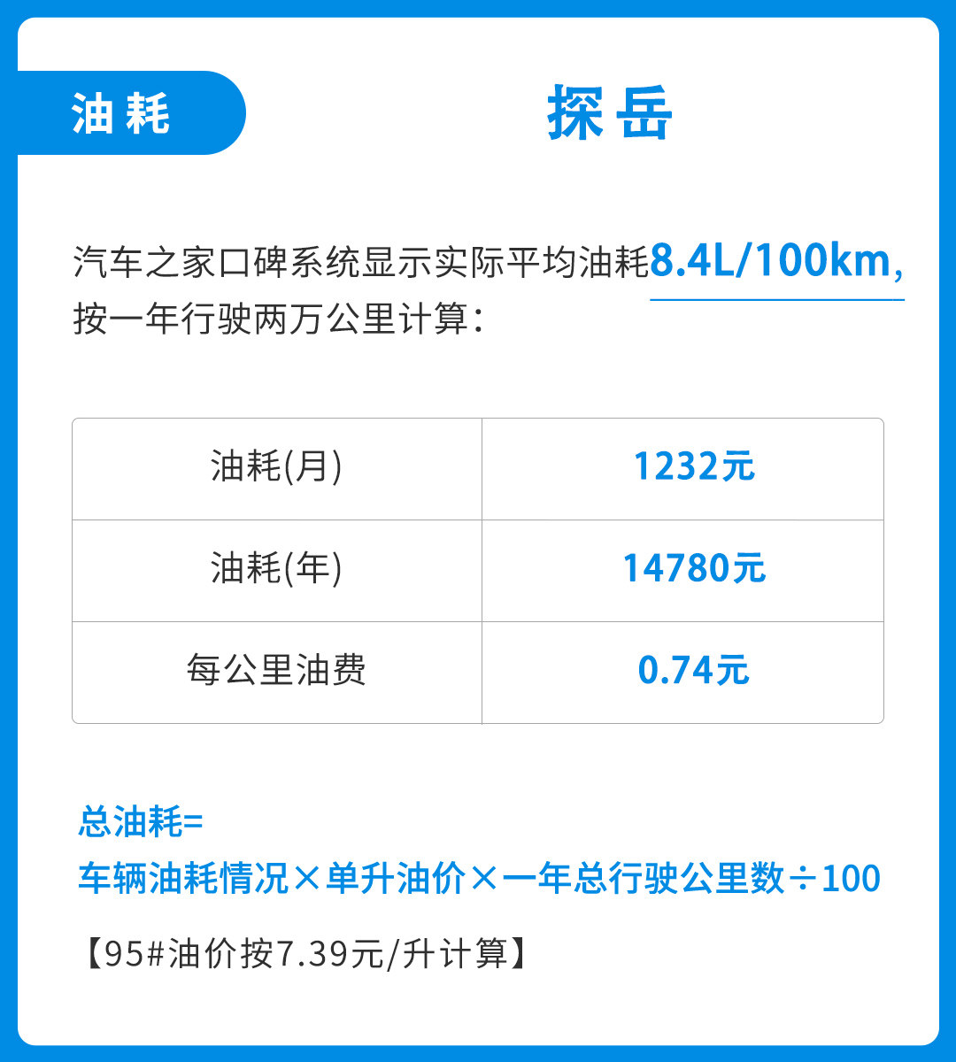 以畅销的2.0T两驱豪华型为例,我们从在汽车之家口碑处了解到,车主的平均油耗为8.4L/100km,按广东地区95号汽油7.39元/升来计算,1年行驶2万公里的油费为14780,平均每月1232元。