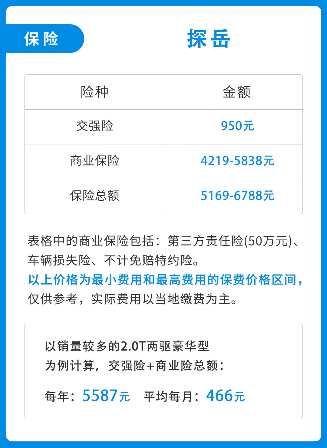 探岳的售价区间为18.88-31.98万元,保险费用因车价和地区而异,我们以广州地区为例,优惠后的裸车价约为16.59-28.99万元。保险按第三方责任险(50万元)、车辆损失险、不计免赔特约险来计算,入门车型的保险为4219元,顶配车型的保险为5838元。