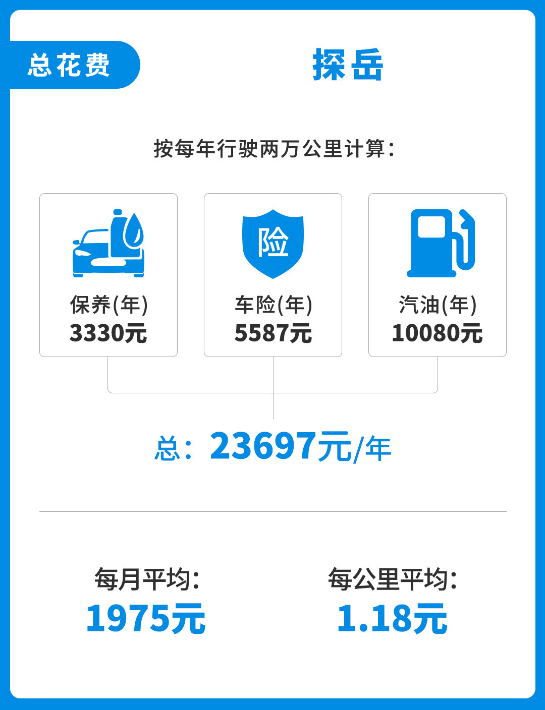 以2.0T两驱豪华型为例,全部费用按最少的计算,探岳每年固定的养车成本是3330+14780+4637=23697元,平均每月约为1975元。