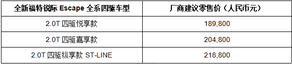 全新福特锐际Escape厂商建议零售价为: