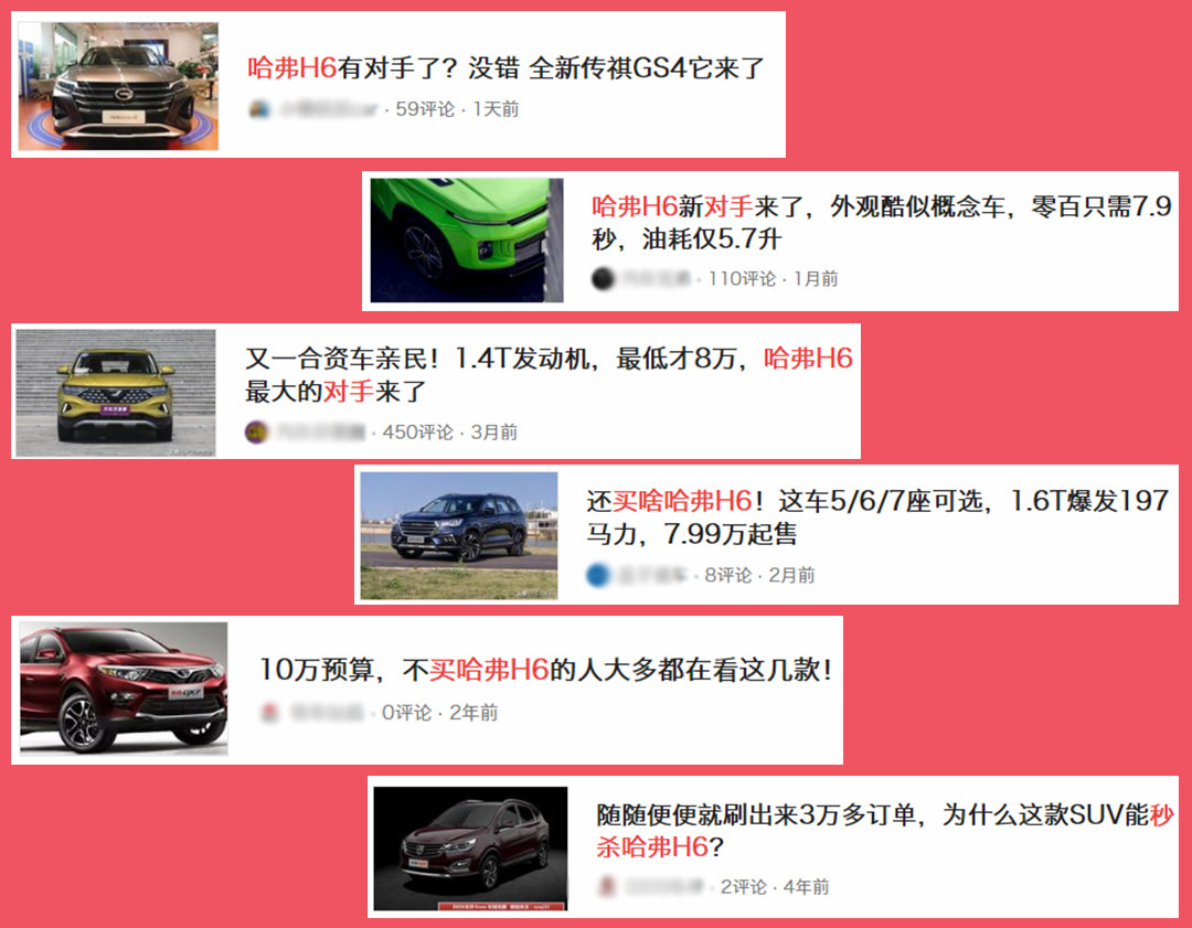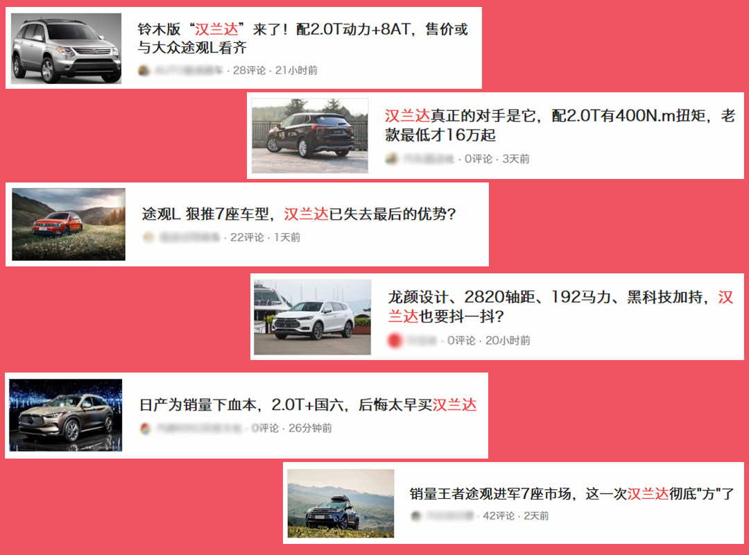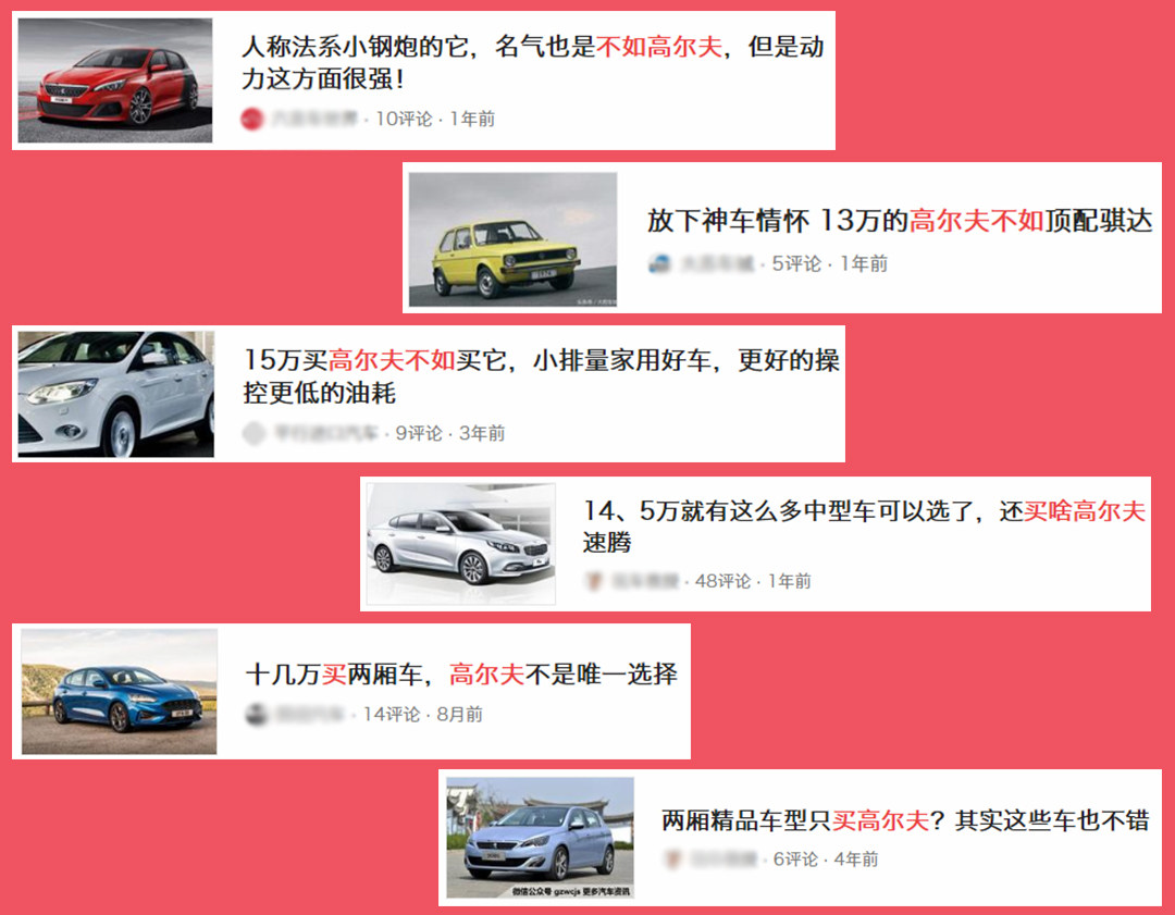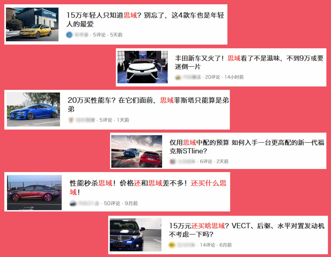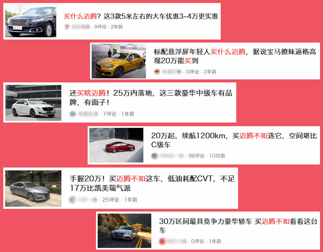 如果是看汽车类文章较多的会发现,很多车型的文章标题中,都含有另外一款车型,而这款车型无不例外都是同级别中的拔尖水准,这样的行为也可看作是蹭热度。
