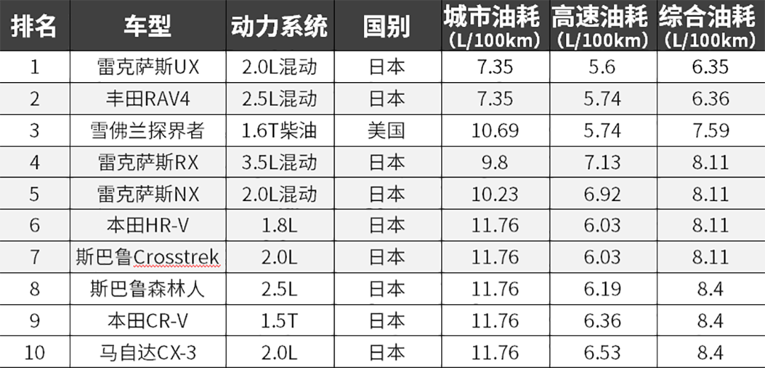 至于第七位,恐怕大家很难想象到它是来自斯巴鲁旗下的Crosstrek,即国内的斯巴鲁XV,根据榜单上的数据,斯巴鲁Crosstrek 2.0L车型的百公里综合油耗为8.11L,并且目前国内还提供2.0L混合动力版本,综合油耗更是能达到百公里7.2L的好成绩。