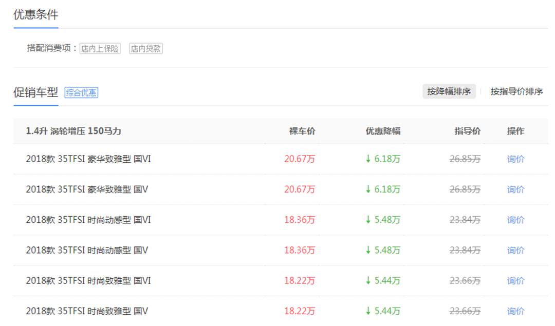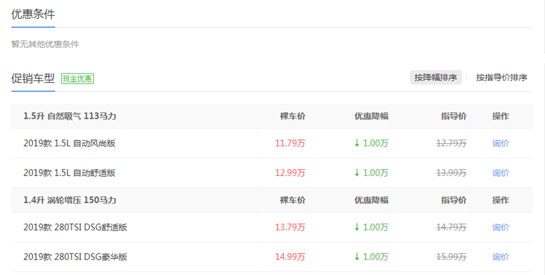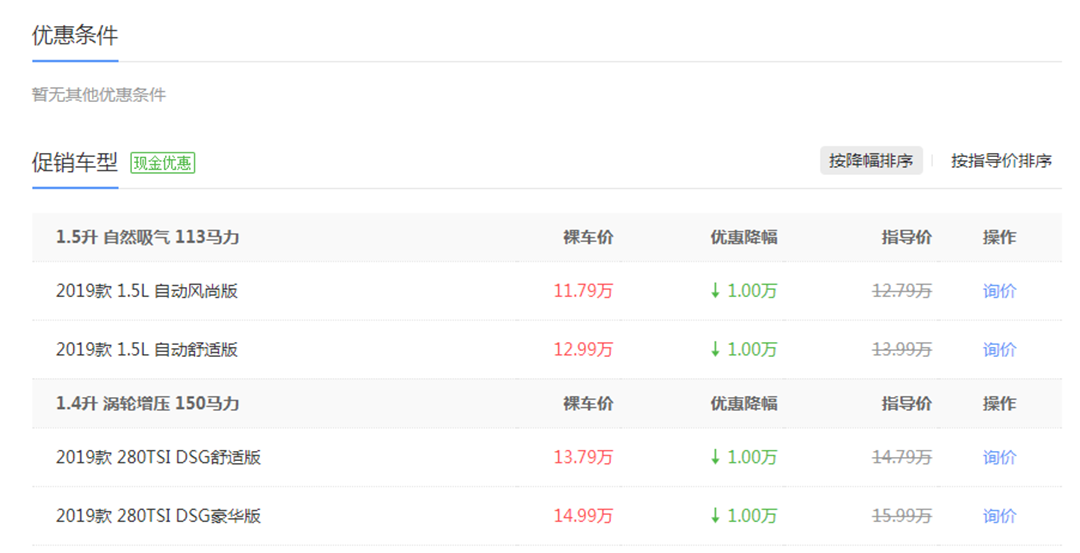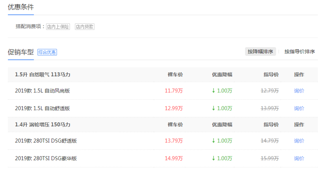 最后看看热度也非常不错的奥迪Q2L,Q2L整体上针对国内消费者作出了不少优化,让更多用户愿意去选择,不过比较可惜的是在内饰上并没有采用奥迪最新的家族化设计。不过,虽然Q2L是作为一款豪华品牌的车型,但却有着非常可观的优惠幅度,优惠后甚至能接近1.5T动力的XR-V售价。