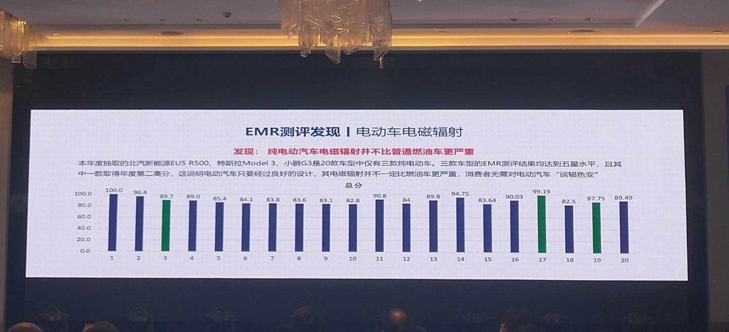 本次总共对20款车进行EMR电磁辐射测试,其中有3款是纯电动车,分别是北汽新能源R500、特斯拉Model 3和小鹏G3,高中低端电动车都有。结果也是这三款电动车的辐射比很多燃油车都要低,这也说明电动车辐射大是谣言。