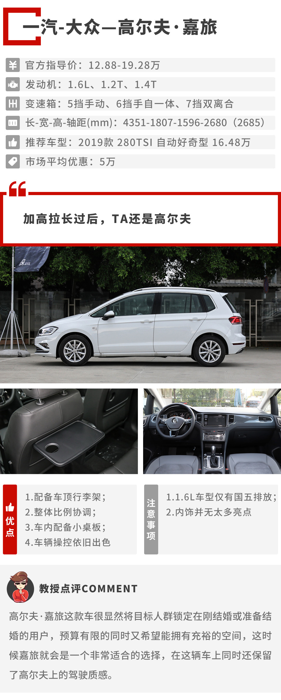 嘉旅在内部设计也是颇为用心的,虽然在中控位置与高尔夫基本无异,但是在前排座椅的背后还配备了小桌板,这一点对于需要照顾宝宝的用户来说非常友好。在动力方面嘉旅也保持了和高尔夫一样的动力,并且在驾驶方面也没有因为尺寸原因带来笨重的感觉,整体还是和高尔夫一致的。由于和高尔夫采用了一样的平台化设计,所以如果想要在改装方面有所方法,那也是不用担心的,高尔夫适合的大部分都适合。