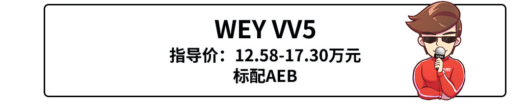 接下来就到性价比高的全系标配AEB的车型了,这类车无疑是最值得购买的。国产车中WEY VV5是比较早配备AEB的车型之一,而且是全系标配。作为一辆SUV来讲,这辆车12.58-17.30万元的指导价格并不贵。
