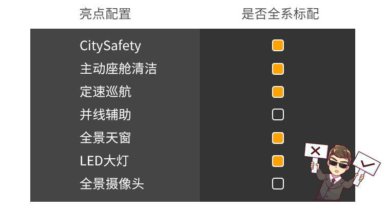 再譬如驾驶辅助系统,沃尔沃的辅助驾驶系统最低配是定速巡航,以外的都是自适应巡航,跟其他品牌不同的是,沃尔沃的ACC能一直保持在车道中间,这可以大大减少跑高速的疲劳;然后是安全方面,疲劳驾驶提醒、主动刹车、车道保持等全套的CitySafety安全辅助驾驶系统是全系标配,这一点BBA同级竞品都没那么厚道。